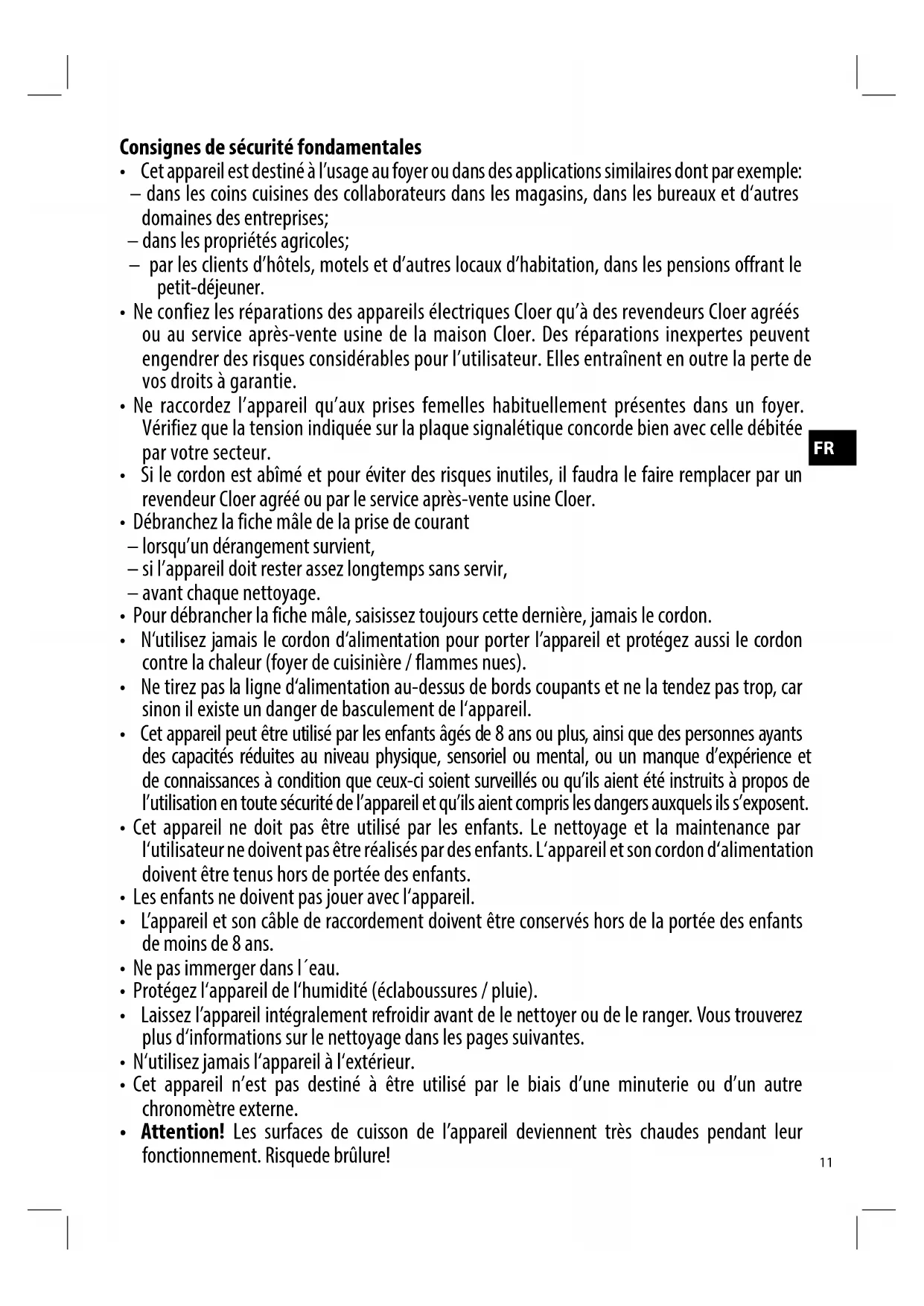 - Ne confiez les réparations des apparciels électriques Cloer qu'à des revendeurs Cloer agrées ou au service après-vente usine de la maison Cloer. Des réparations in expertes peuvent engendrer des risques considérables pour l'utilisateur. Elles entrainent en outre la perte de vos droits à garantie.