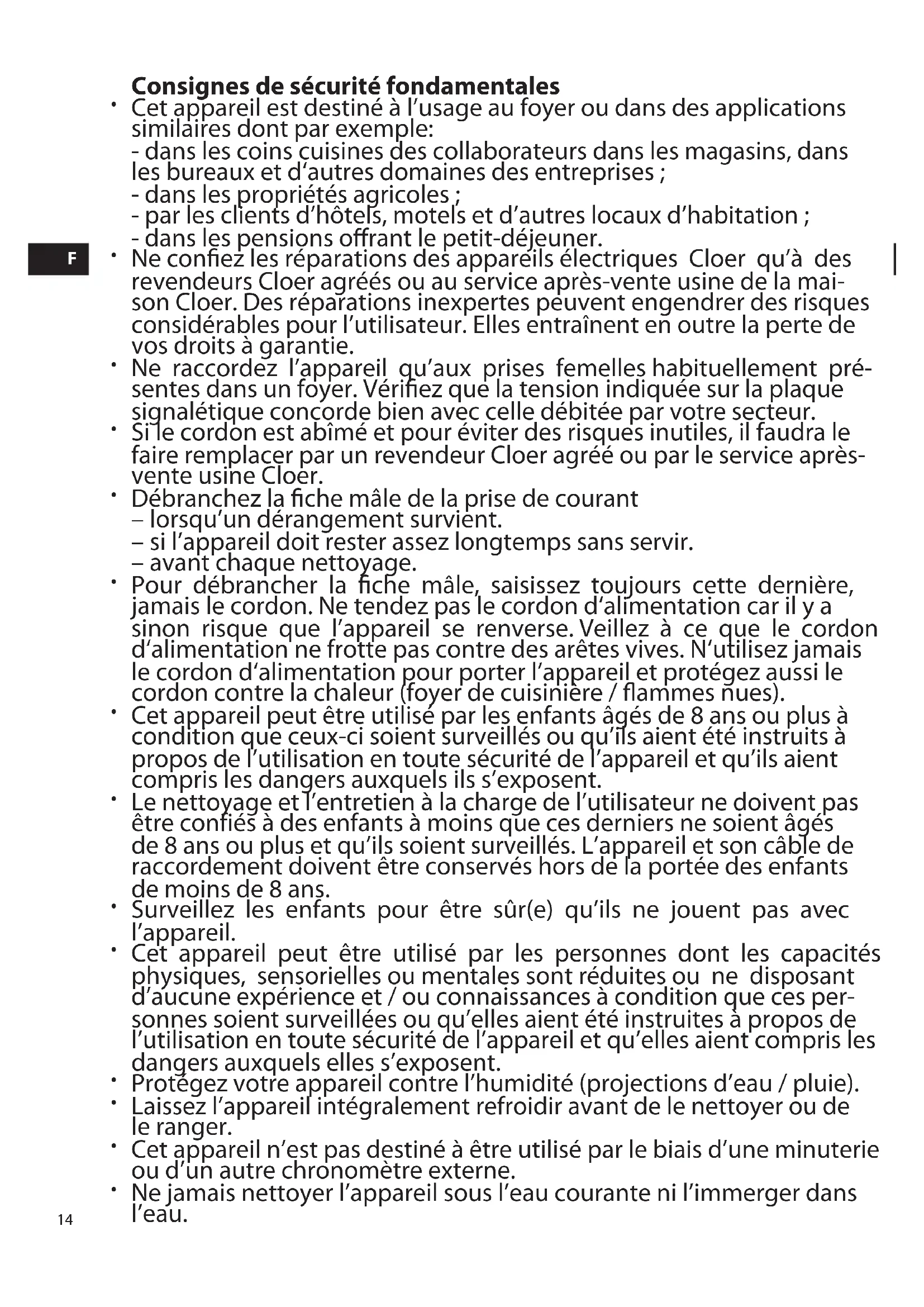 - 14 Consignes de sécurité fondamentales Cet appareil est destiné à l’usage au foyer ou dans des applications similaires dont par exemple: - dans les coins cuisines des collaborateurs dans les magasins, dans les bureaux et d‘autres domaines des entreprises ; - dans les propriétés agricoles ; - par les clients d’hôtels, motels et d’autres locaux d’habitation ; - dans les pensions orant le petit-déjeuner. Ne conez les réparations des appareils électriques Cloer qu’à des revendeurs Cloer agréés ou au service après-vente usine de la mai- son Cloer. Des réparations inexpertes peuvent engendrer des risques considérables pour l’utilisateur. Elles entraînent en outre la perte de vos droits à garantie. Ne raccordez l’appareil qu’aux prises femelles habituellement pré- sentes dans un foyer. Vériez que la tension indiquée sur la plaque signalétique concorde bien avec celle débitée par votre secteur. Si le cordon est abîmé et pour éviter des risques inutiles, il faudra le faire remplacer par un revendeur Cloer agréé ou par le service après- vente usine Cloer. Débranchez la che mâle de la prise de courant – lorsqu’un dérangement survient. – si l’appareil doit rester assez longtemps sans servir. – avant chaque nettoyage. Pour débrancher la che mâle, saisissez toujours cette dernière, jamais le cordon. Ne tendez pas le cordon d‘alimentation car il y a sinon risque que l’appareil se renverse. Veillez à ce que le cordon d‘alimentation ne frotte pas contre des arêtes vives. N‘utilisez jamais le cordon d‘alimentation pour porter l’appareil et protégez aussi le cordon contre la chaleur (foyer de cuisinière / ammes nues). Cet appareil peut être utilisé par les enfants âgés de 8 ans ou plus à condition que ceux-ci soient surveillés ou qu’ils aient été instruits à propos de l’utilisation en toute sécurité de l’appareil et qu’ils aient compris les dangers auxquels ils s’exposent. Le nettoyage et l’entretien à la charge de l’utilisateur ne doivent pas être confiés à des enfants à moins que ces derniers ne soient âgés de 8 ans ou plus et qu’ils soient surveillés. L’appareil et son câble de raccordement doivent être conservés hors de la portée des enfants de moins de 8 ans. Surveillez les enfants pour être sûr(e) qu’ils ne jouent pas avec l’appareil. Cet appareil peut être utilisé par les personnes dont les capacités physiques, sensorielles ou mentales sont réduites ou ne disposant d’aucune expérience et / ou connaissances à condition que ces per- sonnes soient surveillées ou qu’elles aient été instruites à propos de l’utilisation en toute sécurité de l’appareil et qu’elles aient compris les dangers auxquels elles s’exposent. Protégez votre appareil contre l’humidité (projections d’eau / pluie). Laissez l’appareil intégralement refroidir avant de le nettoyer ou de le ranger. Cet appareil n’est pas destiné à être utilisé par le biais d’une minuterie ou d’un autre chronomètre externe. Ne jamais nettoyer l’appareil sous l’eau courante ni l’immerger dans l’eau.