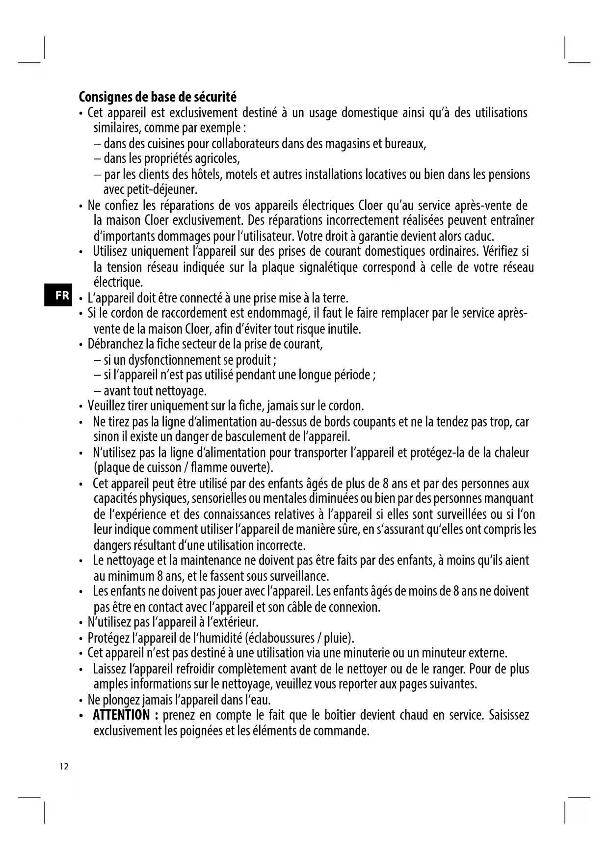 - Ne confiez les réparations de vos appareils électriques Cloer qu’au service après-vente de la maison Cloer exclusivement. Des réparations incorrectement réalisées peuvent entraîner d‘importants dommages pour l‘utilisateur. Votre droit à garantie devient alors caduc.