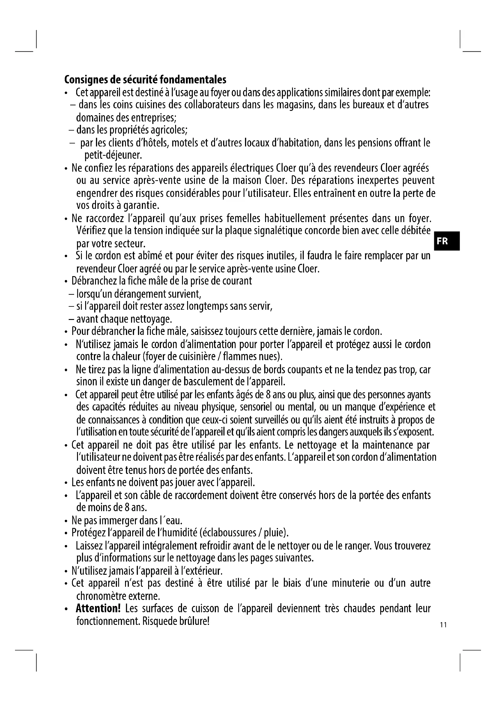- Ne confiez les réparations des appareils électriques Cloer qu'à des revendeurs Cloer agréés ou au service après-vente usine de la maison Cloer. Des réparations inexpertes peuvent engendrer des risques considérables pour l'utilisateur. Elles entraînent en outre la perte de vos droits à garantie.