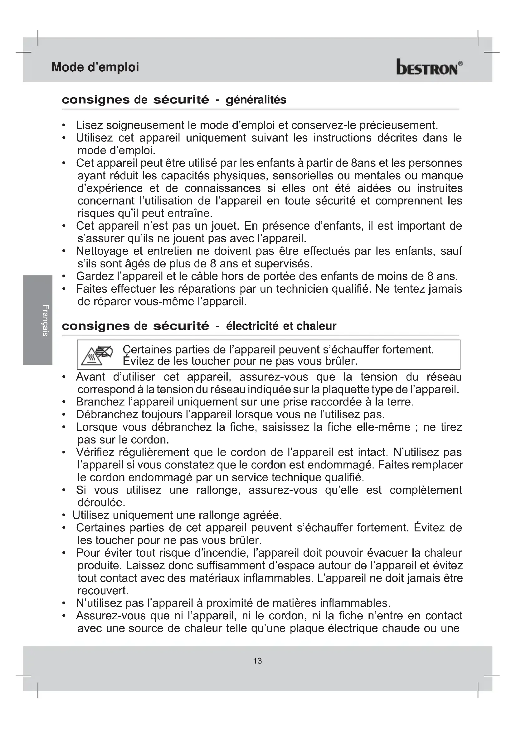Retrouvez gratuitement la notice de l'appareil DUE40028 BESTRON au format PDF.