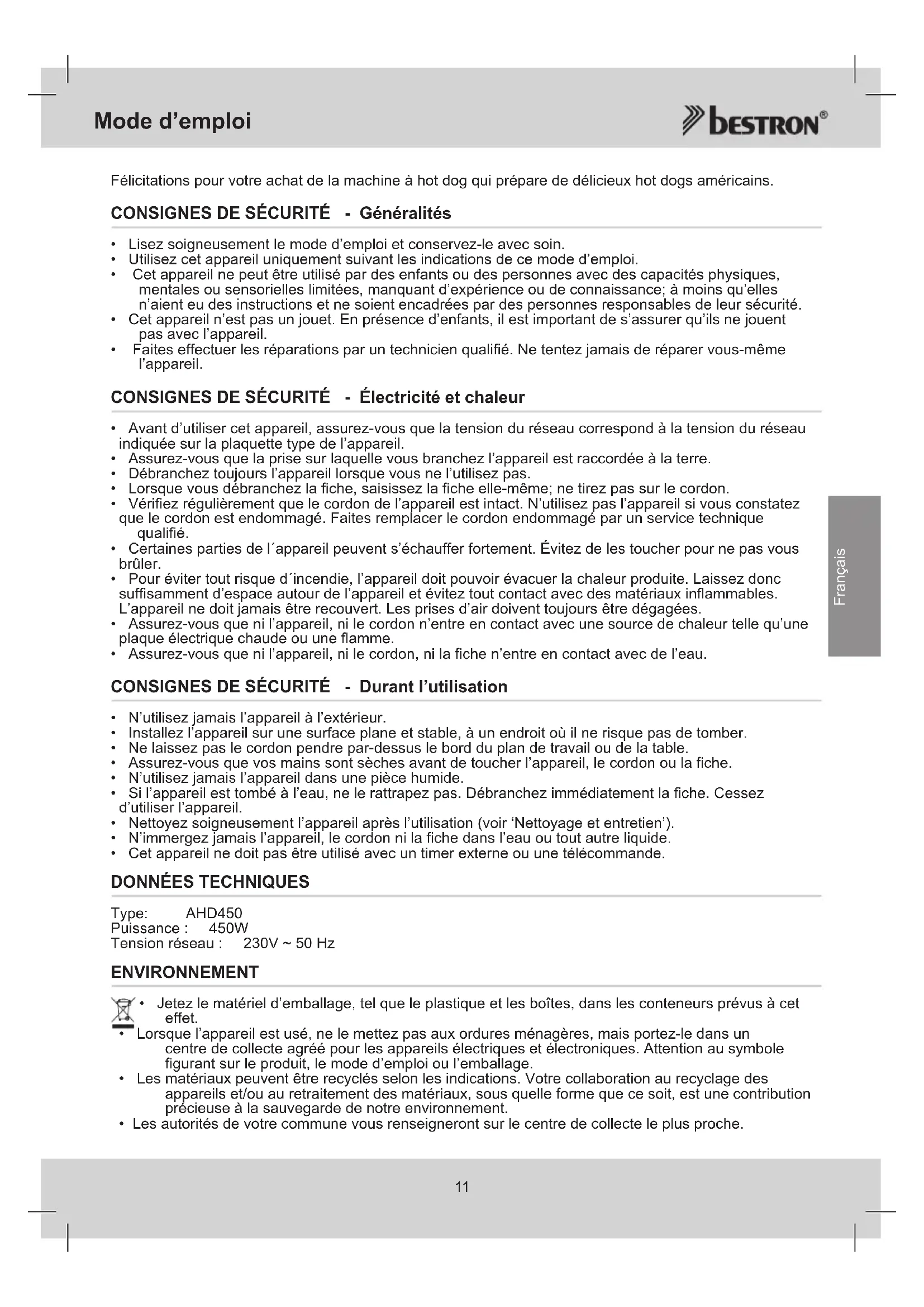 Retrouvez gratuitement la notice de l'appareil AHD450 BESTRON au format PDF.