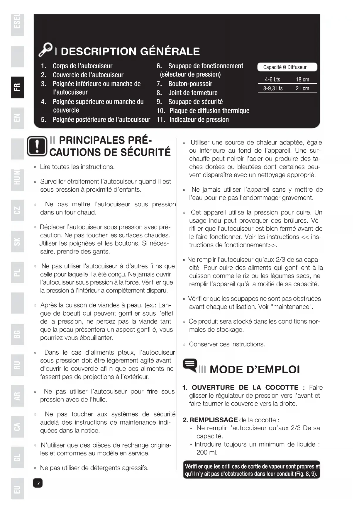 » Ne remplir l’autocuiseur qu’aux 2/3 De sa capacité. » Introduire toujours un minimum de liquide : 200 ml. Vérifi er que les orifi ces de sortie de vapeur sont propres et qu’il n’y ait pas d’obstructions dans leur conduit (Fig. 8, 9). Capacité Ø Diffuseur4-6 Lts8-9,3 Lts18 cm21 cm