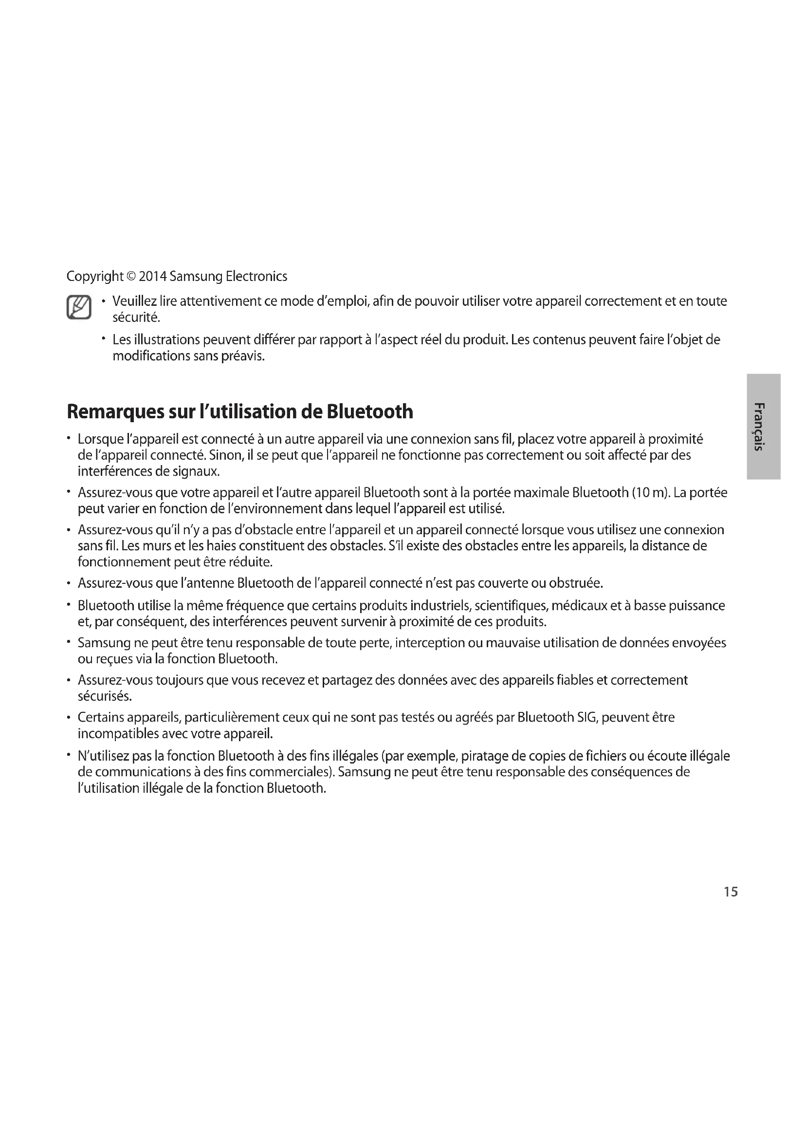 Samsung ne peut être tenu responsable de toute perte, interception ou mauvaise utilisation de données envoyées ou reçues via la fonction Bluetooth.