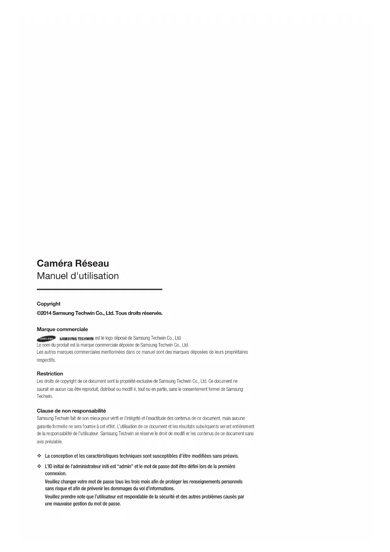 Manuel d'utilisation SND-6084R/ SNO-6084R/SNV-6084RCopyright ©2014 Samsung Techwin Co., Ltd. Tous droits réservés. Marque commerciale est le logo déposé de Samsung Techwin Co., Ltd. Le nom du produit est la marque commerciale déposée de Samsung Techwin Co., Ltd. Les autres marques commerciales mentionnées dans ce manuel sont des marques déposées de leurs propriétaires respectifs. Restriction Les droits de copyright de ce document sont la propriété exclusive de Samsung Techwin Co., Ltd. Ce document ne saurait en aucun cas être reproduit, distribué ou modifi é, tout ou en partie, sans le consentement formel de Samsung Techwin. Clause de non responsabilité Samsung Techwin fait de son mieux pour vérifi er l’intégrité et l’exactitude des contenus de ce document, mais aucune garantie formelle ne sera fournie à cet effet. L’utilisation de ce document et les résultats subséquents seront entièrement de la responsabilité de l’utilisateur. Samsung Techwin se réserve le droit de modifi er les contenus de ce document sans avis préalable.