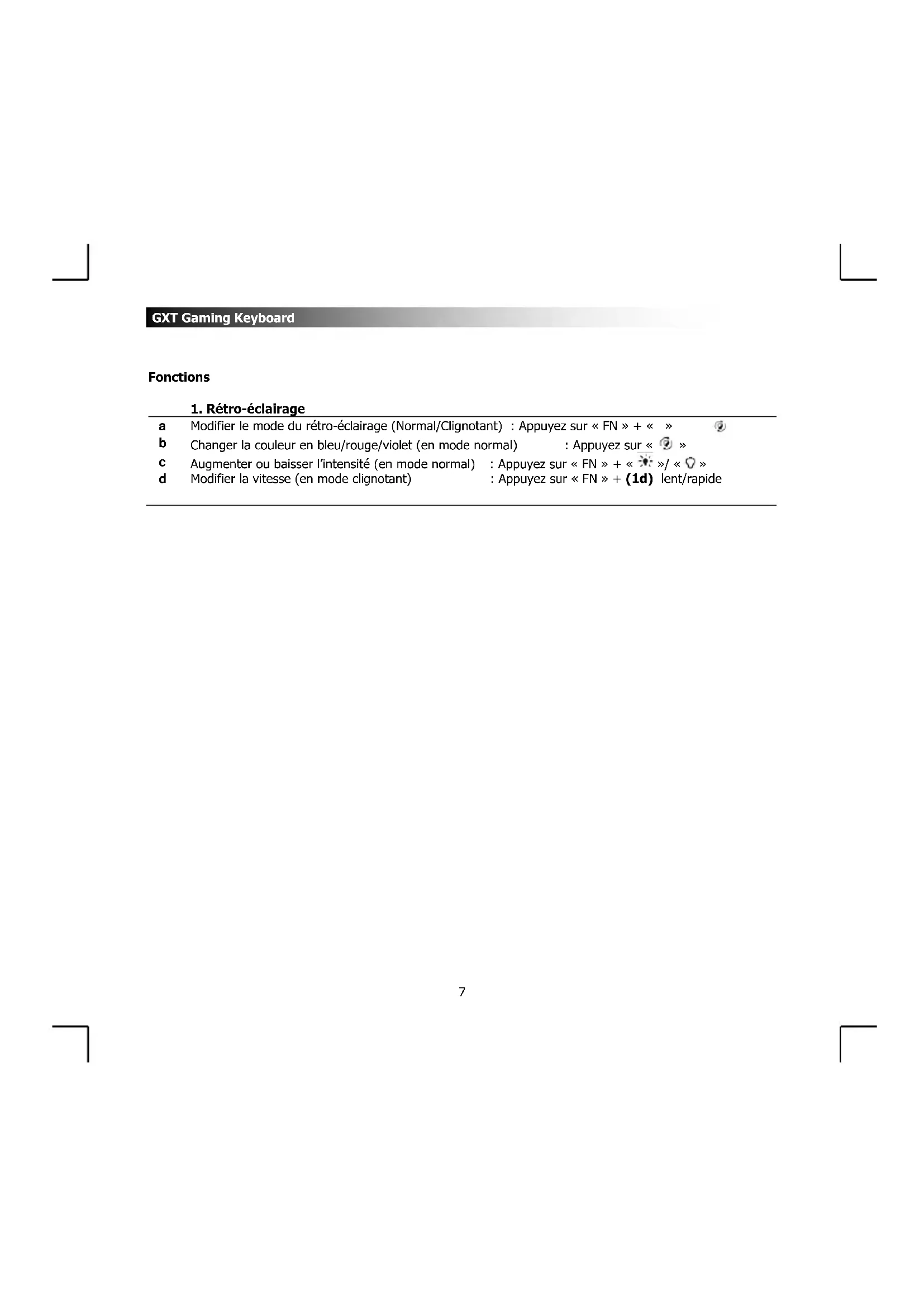 Modifier le mode du rétro-éclairage (Normal/Clignotant) : Appuyez sur « FN » + « » Changer la couleur en bleu/rouge/violet (en mode normal) : Appuyez sur « » Augmenter ou baisser l’intensité (en mode normal) : Appuyez sur « FN » + « »/ « » Modifier la vitesse (en mode clignotant) : Appuyez sur « FN » + (1d) lent/rapideGXT Gaming Keyboard