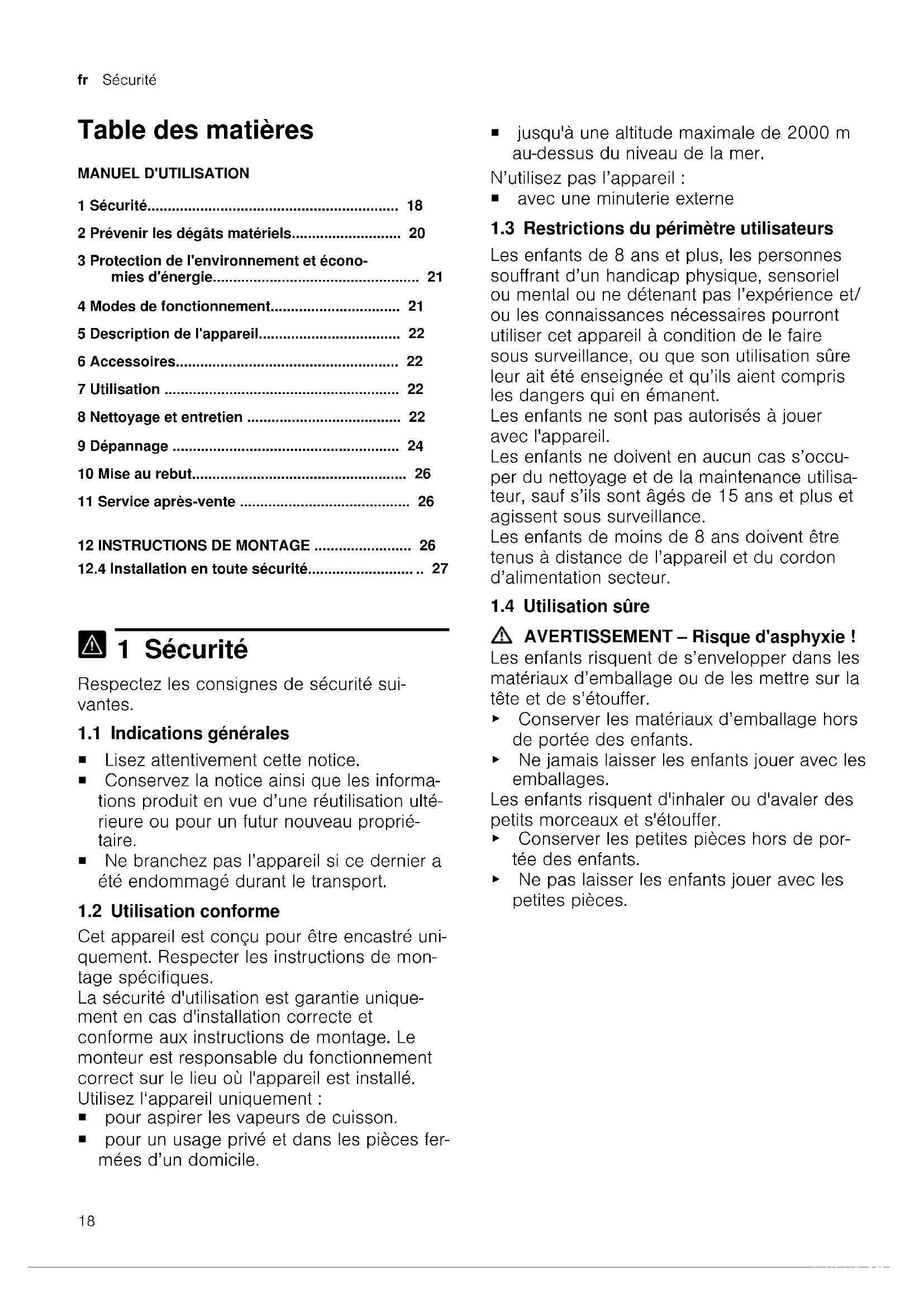 1 Sécurité Respectez les consignes de sécurité sui- vantes. 1.1 Indications générales ¡ Lisez attentivement cette notice. ¡ Conservez la notice ainsi que les informa- tions produit en vue d’une réutilisation ulté- rieure ou pour un futur nouveau proprié- taire. ¡ Ne branchez pas l’appareil si ce dernier a été endommagé durant le transport. 1.2 Utilisation conforme Cet appareil est conçu pour être encastré uni- quement. Respecter les instructions de mon- tage spécifiques. La sécurité d'utilisation est garantie unique- ment en cas d'installation correcte et conforme aux instructions de montage. Le monteur est responsable du fonctionnement correct sur le lieu où l'appareil est installé. Utilisez l‘appareil uniquement: ¡ pour aspirer les vapeurs de cuisson. ¡ pour un usage privé et dans les pièces fer- mées d’un domicile. ¡ jusqu'à une altitude maximale de 2000m au-dessus du niveau de la mer. N’utilisez pas l’appareil: ¡ avec une minuterie externe 1.3 Restrictions du périmètre utilisateurs Les enfants de 8 ans et plus, les personnes souffrant d’un handicap physique, sensoriel ou mental ou ne détenant pas l’expérience et/ ou les connaissances nécessaires pourront utiliser cet appareil à condition de le faire sous surveillance, ou que son utilisation sûre leur ait été enseignée et qu’ils aient compris les dangers qui en émanent. Les enfants ne sont pas autorisés à jouer avec l'appareil. Les enfants ne doivent en aucun cas s’occu- per du nettoyage et de la maintenance utilisa- teur, sauf s’ils sont âgés de 15ans et plus et agissent sous surveillance. Les enfants de moins de 8ans doivent être tenus à distance de l’appareil et du cordon d’alimentation secteur. 1.4 Utilisation sûre AVERTISSEMENT‒Risque d'asphyxie! Les enfants risquent de s’envelopper dans les matériaux d’emballage ou de les mettre sur la tête et de s’étouffer. ▶ Conserver les matériaux d’emballage hors de portée des enfants. ▶ Ne jamais laisser les enfants jouer avec les emballages. Les enfants risquent d'inhaler ou d'avaler des petits morceaux et s'étouffer. ▶ Conserver les petites pièces hors de por- tée des enfants. ▶ Ne pas laisser les enfants jouer avec les petites pièces.Sécurité fr