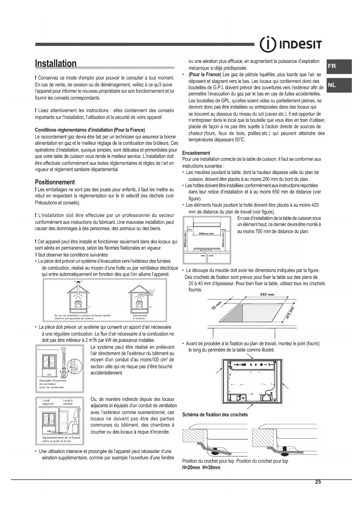 - La découpe du meuble doit avoir les dimensions indiquées par la gure. Des crochets de xation sont prévus pour xer la table sur des plans de 20 à 40 mm d’épaisseur. Pour bien xer la table, utilisez tous les crochets fournis. 555 mm 55 mm 475 mm