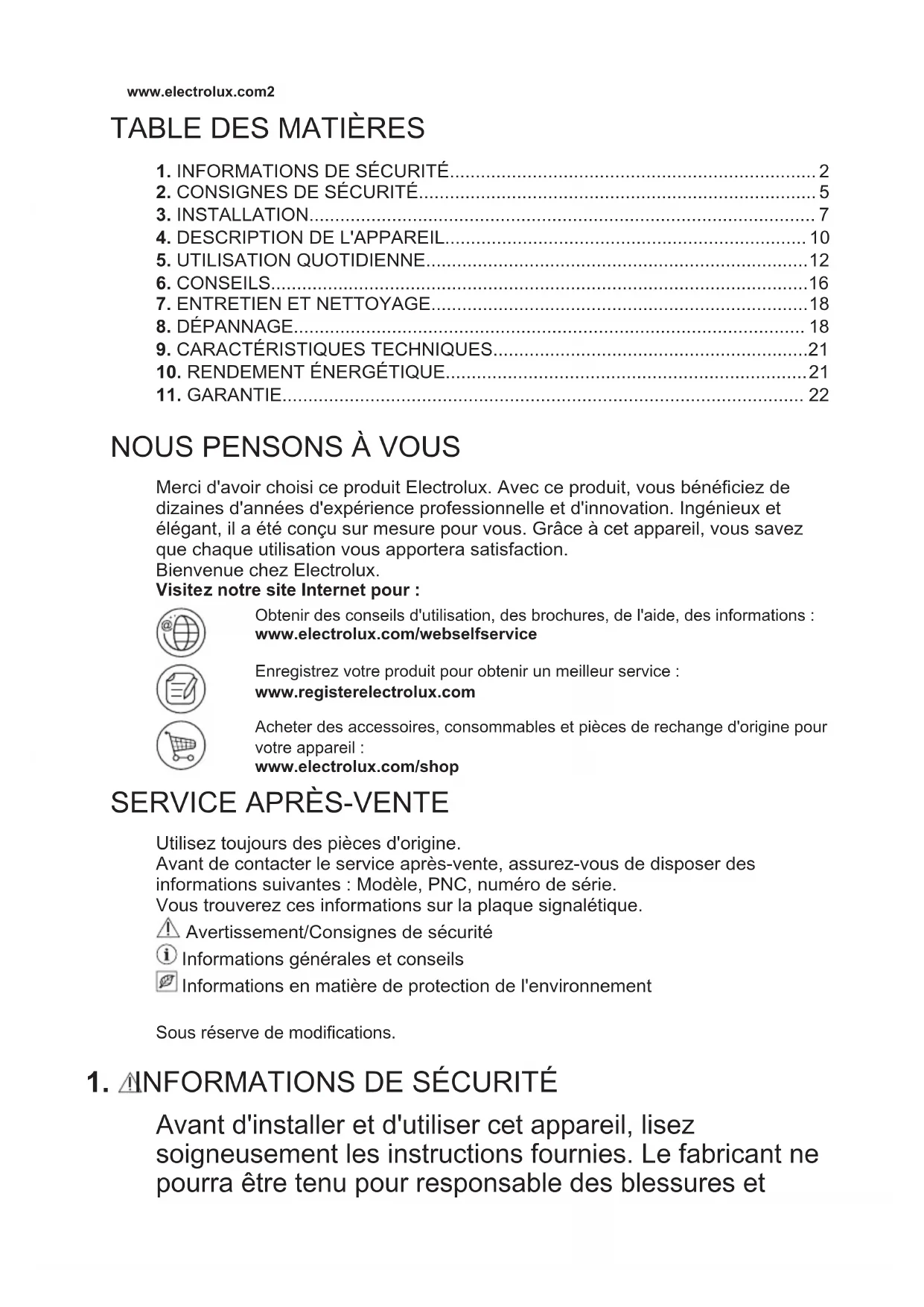 Avant d'installer et d'utiliser cet appareil, lisez soigneusement les instructions fournies. Le fabricant ne pourra être tenu pour responsable des blessures et www.electrolux.com2dégâts résultant d'une mauvaise installation ou utilisation. Conservez toujours les instructions dans un lieu sûr et accessible pour vous y référer ultérieurement.