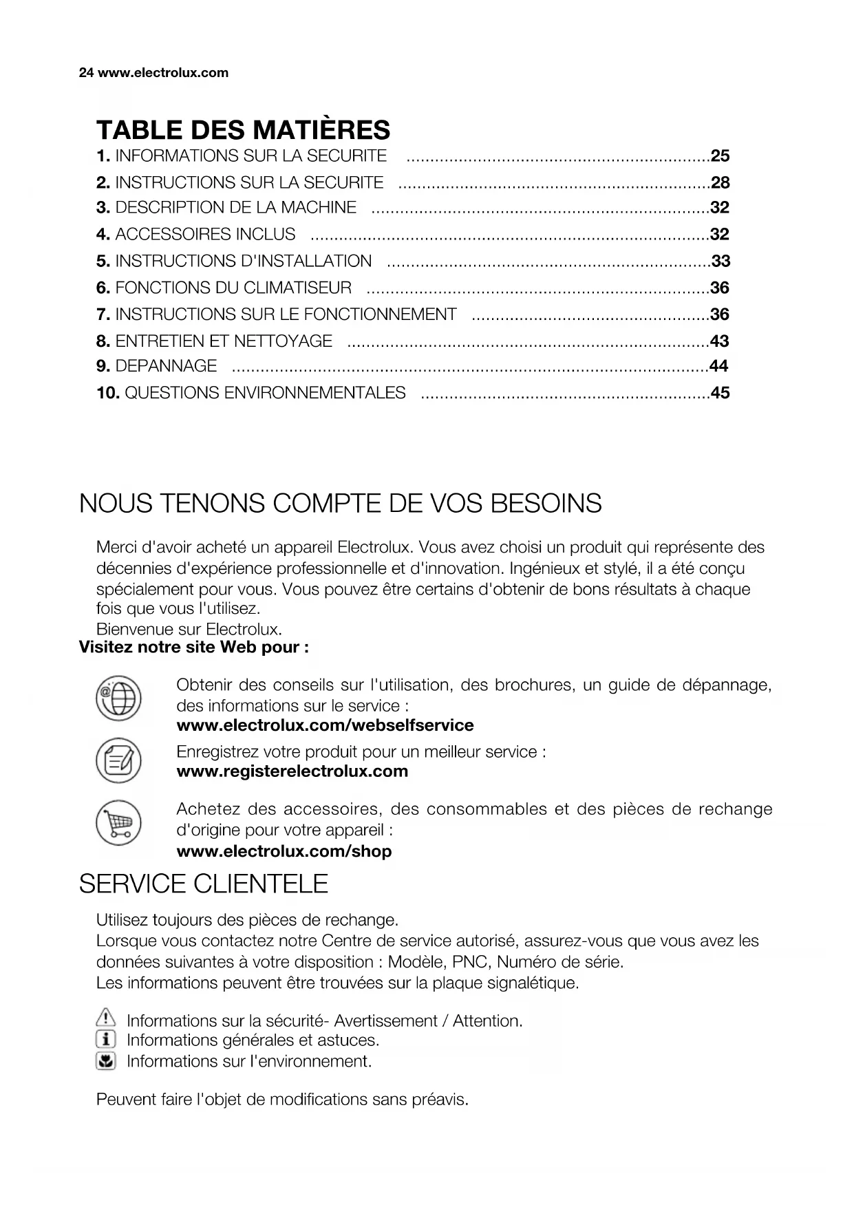 SERVICE CLIENTELE Merci d'avoir acheté un appareil Electrolux. Vous avez choisi un produit qui représente des décennies d'expérience professionnelle et d'innovation. Ingénieux et stylé, il a été conçu spécialement pour vous. Vous pouvez être certains d'obtenir de bons résultats à chaque fois que vous l'utilisez. Bienvenue sur Electrolux. Utilisez toujours des pièces de rechange. Lorsque vous contactez notre Centre de service autorisé, assurez-vous que vous avez les données suivantes à votre disposition : Modèle, PNC, Numéro de série. Les informations peuvent être trouvées sur la plaque signalétique. Peuvent faire l'objet de modifications sans préavis. Informations sur la sécurité- Avertissement / Attention. Informations générales et astuces. Informations sur l'environnement. Obtenir des conseils sur l'utilisation, des brochures, un guide de dépannage, des informations sur le service : www.electrolux.com/webselfservice Visitez notre site Web pour : Enregistrez votre produit pour un meilleur service : www.registerelectrolux.com Achetez des accessoires, des consommables et des pièces de rechange d'origine pour votre appareil : www.electrolux.com/shop