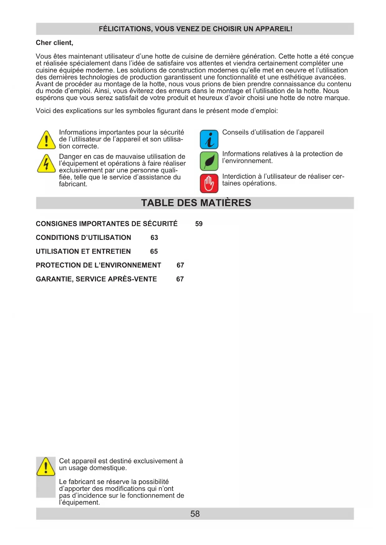 Cher client, Vous êtes maintenant utilisateur d’une hotte de cuisine de dernière génération. Cette hotte a été conçue et réalisée spécialement dans l’idée de satisfaire vos attentes et viendra certainement compléter une cuisine équipée moderne. Les solutions de construction modernes qu’elle met en oeuvre et l’utilisation des dernières technologies de production garantissent une fonctionnalité et une esthétique avancées. Avant de procéder au montage de la hotte, nous vous prions de bien prendre connaissance du contenu du mode d’emploi. Ainsi, vous éviterez des erreurs dans le montage et l’utilisation de la hotte. Nous espérons que vous serez satisfait de votre produit et heureux d’avoir choisi une hotte de notre marque. FÉLICITATIONS, VOUS VENEZ DE CHOISIR UN APPAREIL! Voici des explications sur les symboles gurant dans le présent mode d’emploi: Interdiction à l’utilisateur de réaliser cer- taines opérations. Danger en cas de mauvaise utilisation de l’équipement et opérations à faire réaliser exclusivement par une personne quali- ée, telle que le service d’assistance du fabricant. Informations importantes pour la sécurité de l’utilisateur de l’appareil et son utilisa- tion correcte. Conseils d’utilisation de l’appareil