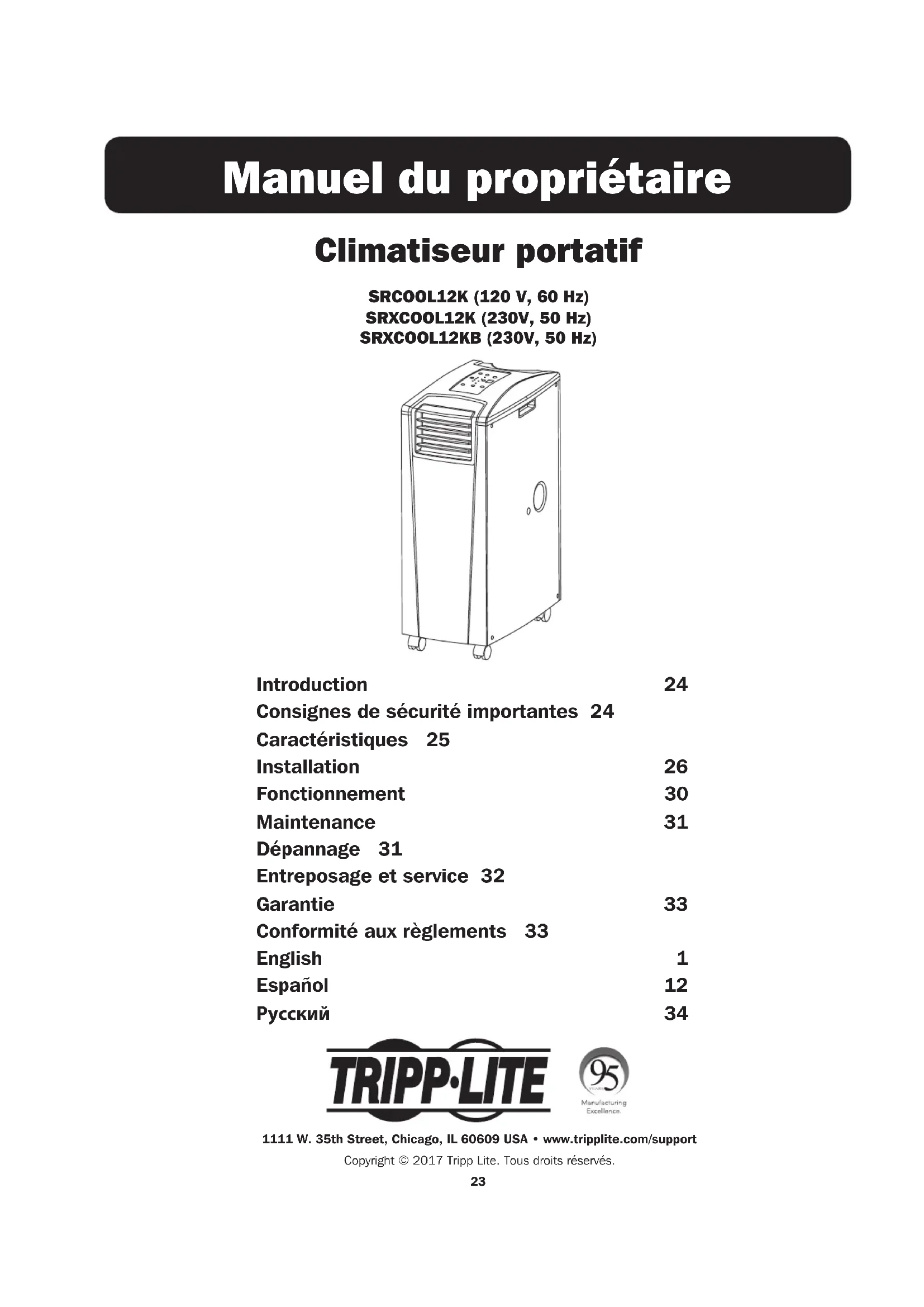 - Renvoyer le matériel neuf pour recyclage quand ceci devient éventuellement un rebut. Il est déconseillé d’utiliser cet équipement dans des applications médicales où une panne de cet équipement pourrait normalement provoquer la panne de l’équipement de survie ou altérer notablement sa sécurité ou son efficacité. Tripp Lite applique une politique d’amélioration continue. Les spécifications peuvent être modifiées sans préavis.34 Переносной блок кондиционирования SRCOOL12K (120 В, 60 Гц) SRXCOOL12K (230 В, 50 Гц) SRXCOOL12KB (230V, 50 Hz) Руководство пользователя Введение 35 Важные правила техники безопасности 35 Детали и элементы 36 Установка 37 Эксплуатация 41 Техническое обслуживание 42 Выявление и устранение неисправностей