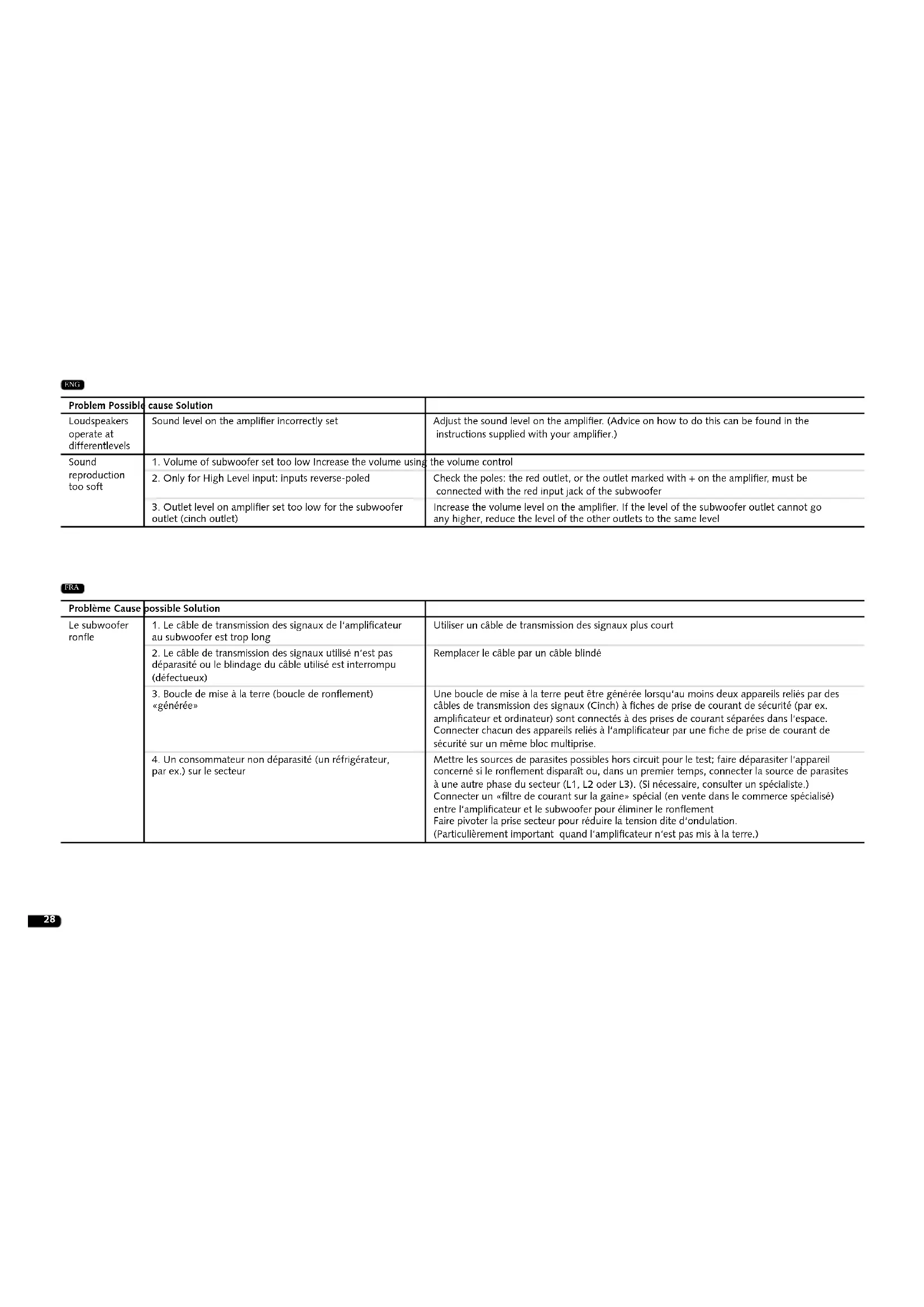 par ex.) sur le secteur Mettre les sources de parasites possibles hors circuit pour le test; faire déparasiter l‘appareil concerné si le ronflement disparaît ou, dans un premier temps, connecter la source de parasites à une autre phase du secteur (L1, L2 oder L3). (Si nécessaire, consulter un spécialiste.) Connecter un «filtre de courant sur la gaine» spécial (en vente dans le commerce spécialisé) entre l‘amplificateur et le subwoofer pour éliminer le ronflement Faire pivoter la prise secteur pour réduire la tension dite d‘ondulation. (Particulièrement important quand l‘amplificateur n‘est pas mis à la terre.) FRA29 FRA Problème Cause possible Solution Enceintes restitu- ent des niveaux sonores différents Le niveau est mal réglé sur l’ampli Adapter le niveau sur l’ampli (consulter aussi la notice d’utilisation de l’ampli pour savoir comment procéder) Restitution du son trop faible