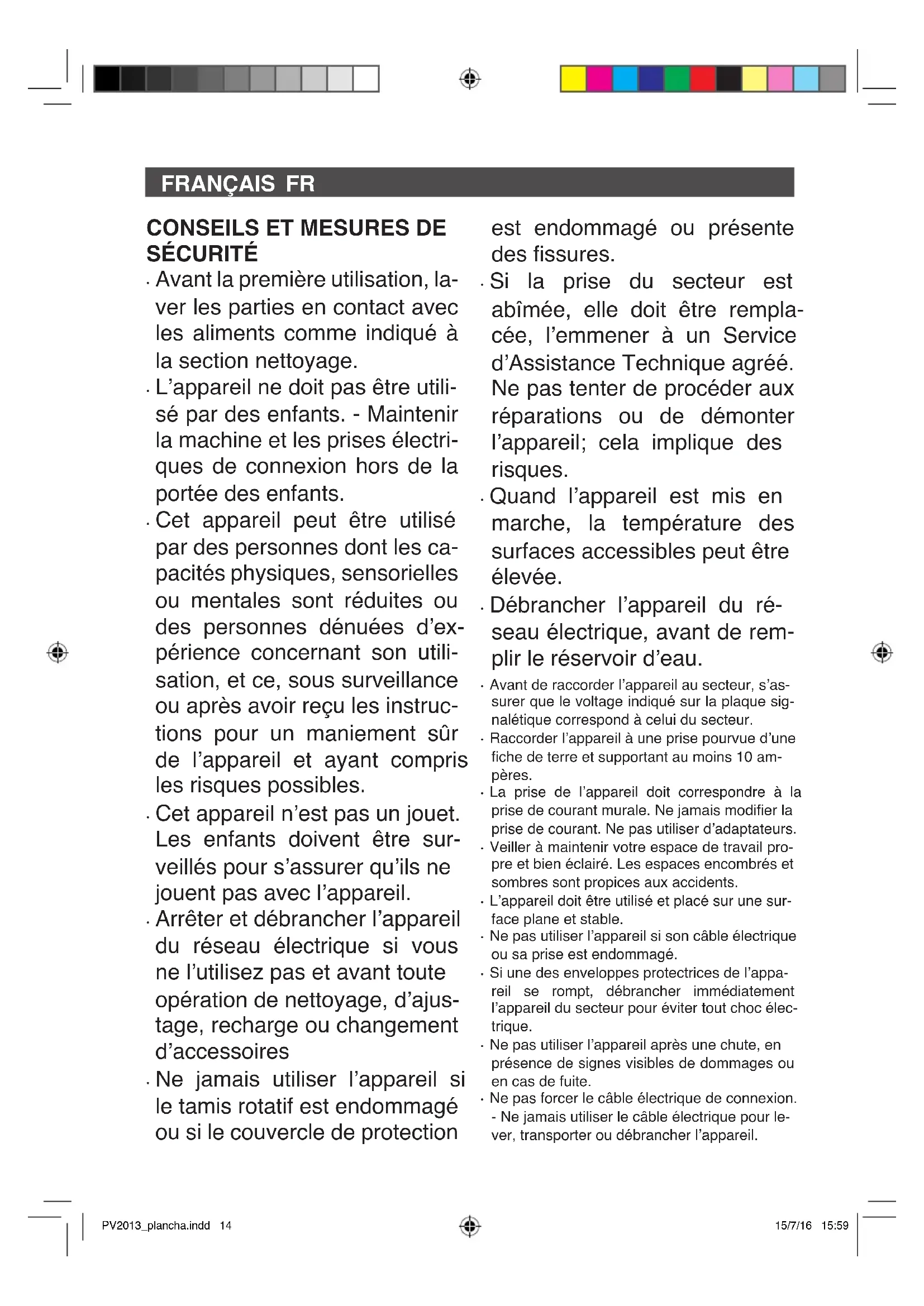 - Appuyez sur le bouton du pulvérisateur (7), autant de fois que vous voulez utiliser cette fonction. AUTRES FONCTIONS SySTÈME ANTITARTRE Le fer à repasser est doté d’un système antitartre innovant, comprenant un ltre en résine qui retient les substances calcaires de l’eau, évitant ainsi qu’elles remplissent la chambre à vapeur de la se- melle. Ce système permet de prolonger la durée de vie du fer à repasser. L’existence de ce système antitartre ne dispense pas des conseils ayant trait à la dureté de l’eau gurant dans le paragraphe « AVANT DE COM- MENCER À REPASSER . SySTÈME ANTI-GOUTTE Le fer comprend un système anti-goutte qui évi- te que le fer ne goutte même lorsqu’il est éteint. NETTOyAGE ET STOCKAGE +Nettoyez l’appareil avant la première utilisa- tion, immédiatement après chaque utilisation et après une longue période d’inutilisation. SEMELLE 1 Débranchez le fer et laissez refroidir la seme- lle. Pour nettoyer la semelle, utilisez des produits PV2013_plancha.indd 17 15/7/16 15:59écologiques à base d’argiles. PARTIE EXTERNE 1 Pour nettoyer la partie externe du fer, utilisez un chiffon humide imbibé d’eau et de savon. Ne le nettoyez pas avec des produits chimi- ques abrasifs, ni des dissolvants, puisque cela pourrait endommager les parties en plas- tique et/ou éliminer certaines marques et/ ou indications. 2 Rangez votre fer en position verticale, enrou- lez le câble autour du socle et xez-le à l’aide de l’attache-câble. +Bien que le câble d’alimentation soit pourvu d’un coude permettant la rotation à 360º, NE FORCEZ JAMAIS ce câble en l’enroulant au- tour du produit lors du premier tour. FONCTION AUTONETTOyANTE +Il est recommandé d’utiliser la fonction au- tonettoyante une fois par mois environ, en fonction de la fréquence d’utilisation et de la dureté de l’eau employée. 1 Assurez-vous que le réservoir est rempli jus- qu’à la moitié. 2 Placez le fer en position verticale. 3 Branchez le fer et placez le sélecteur de tem- pérature (9) sur Max. 4 Attendez que le voyant (11) s’éteigne pour indiquer que la température souhaitée a été atteinte. 5 Tournez le sélecteur de température (9) sur la position 0 et débranchez le fer. 6 Placez le fer en position horizontale au-des- sus de l’évier ou d’unrécipient adéquat et appuyez sur le bouton d’autonettoyage (11), en lemaintenant dans cette position tout en réalisant de légers mouvementsde va et vient avec le fer. La vapeur et l’eau s’échapperont par lesorices du fer en entraînant les saletés et les impuretés qu’il contient. (Fig 6-7) Réalisez l’opération avec précaution, puisque l’eau et la vapeur qui sortent sont très chaudes et peuvent provoquer des brûlures. 7 Placez le fer en position verticale et attendez qu’il soit complètement refroidi. 8 Nettoyez la semelle avec un chiffon humide. +Nous vous rappelons que tout dommage oc- casionné par le calcaire ne sera pas couvert par la garantie. Ce symbole signie qu’il est important de lire le mode d’emploi Ce symbole signie que l’utilisateur doit lire attentivement le mode d’emploi avant d’uti- liser le produit. Ce symbole signie que le produit ne doit pas être recouvert. Ce symbole indique que la surface peut se chauffer pendant l’usage. Cet appareil est certié conforme à la Directive 2014/35/EU de Basse Tension, de même qu’à la Directive 2014/30/EU en matière de Compatibili- té Électromagnétique, à la Directive 2011/65/EU relative à la limitation de l’utilisation de certaines substances dangereuses dans les équipements électriques et électroniques et à la Directive 2009/125/EC sur les conditions de conception écologique applicable aux produits en rapport avec l’énergie.