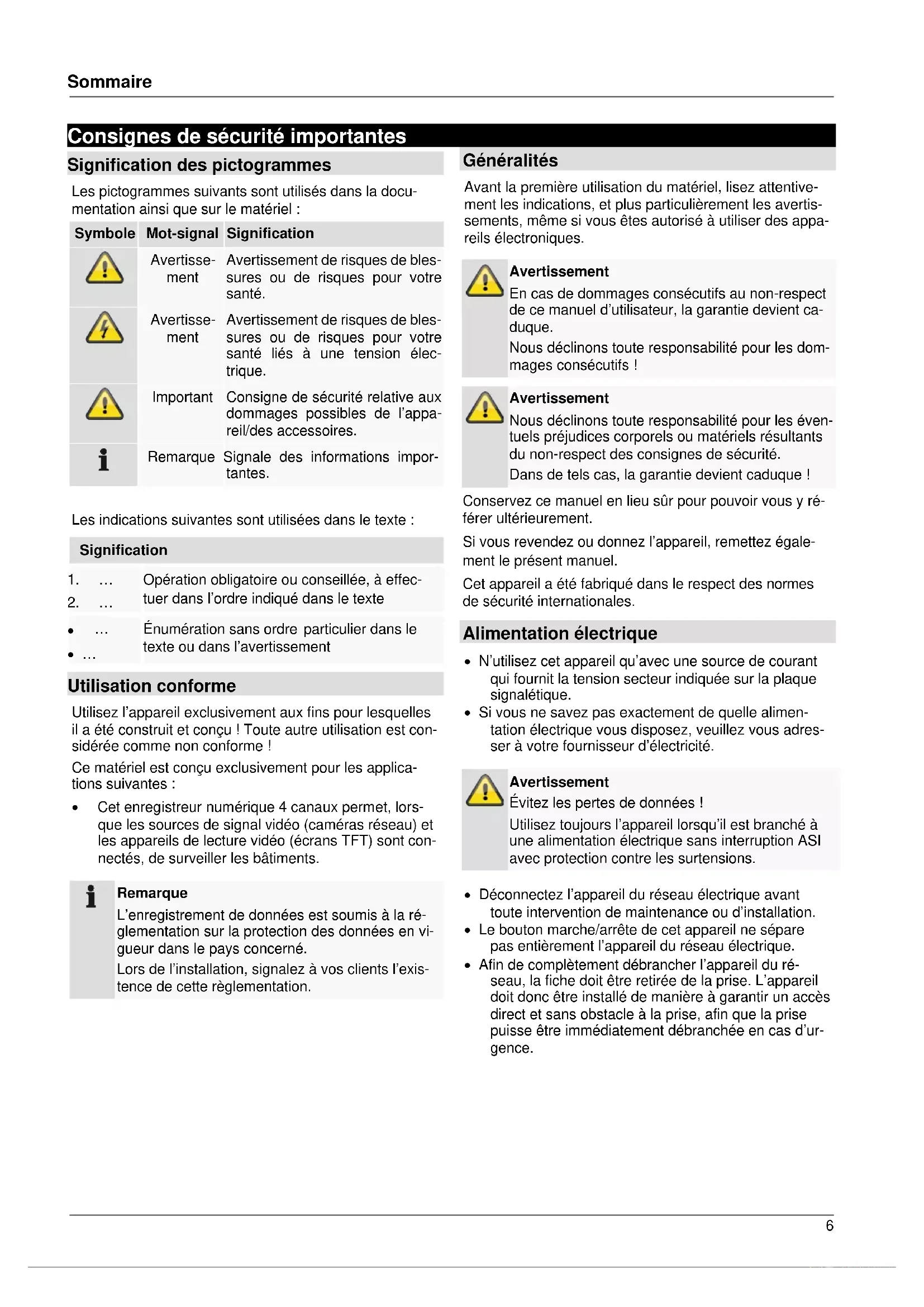 - Cet enregistreur numérique 4 canaux permet, lors- que les sources de signal vidéo (caméras réseau) et les appareils de lecture vidéo (écrans TFT) sont con- nectés, de surveiller les bâtiments. Remarque L’enregistrement de données est soumis à la ré- glementation sur la protection des données en vi- gueur dans le pays concerné. Lors de l’installation, signalez à vos clients l’exis- tence de cette règlementation.