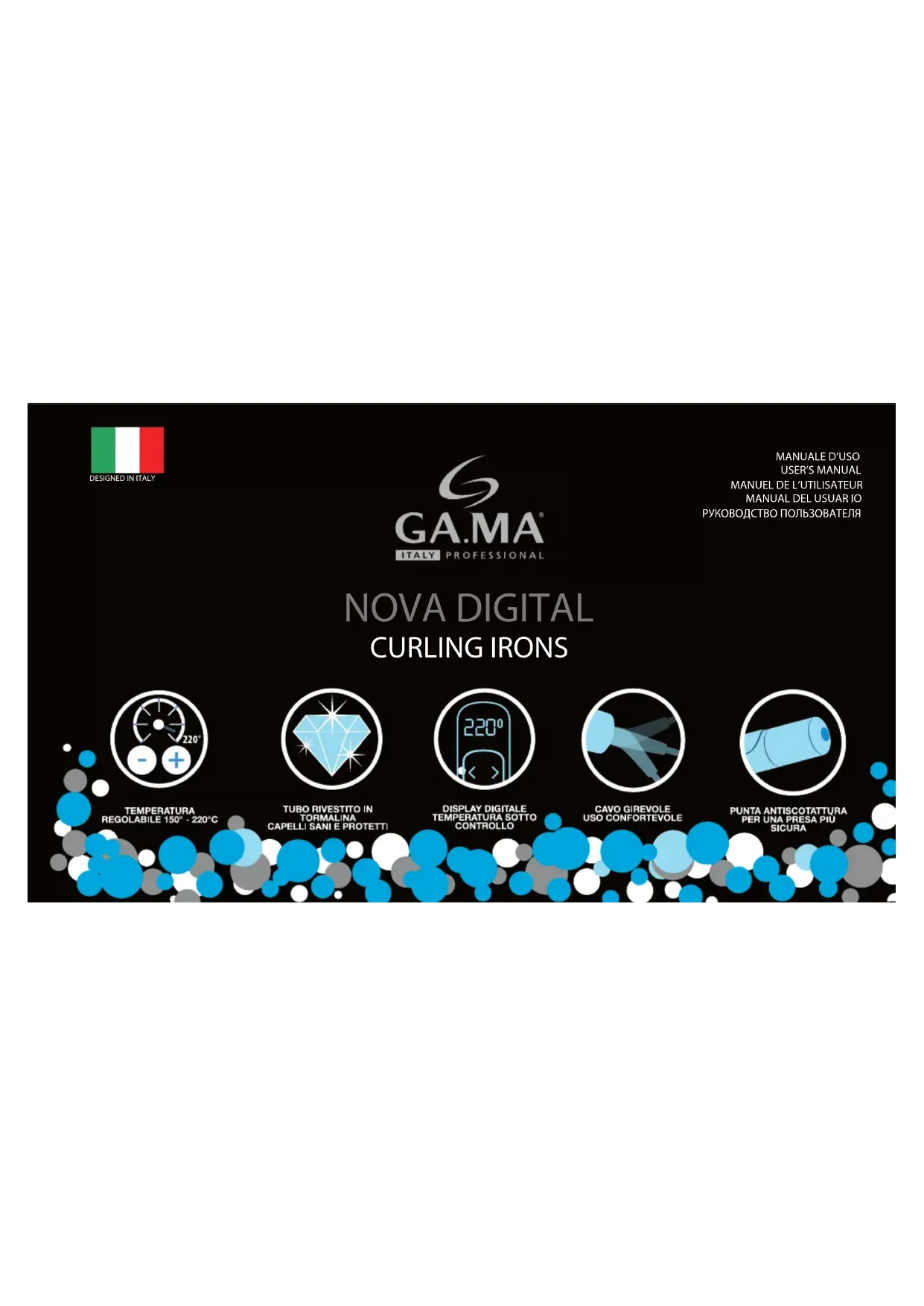 - NOVA DIGITAL 33 Nous vous remercions d’avoir acheté un produit GAMA. Nous sommes certains que vous apprécierez le soin avec lequel il a été conçu et fabriqué. La recherche GAMA a toujours conjugué innovation et technologie en vue de proposer des produits de très haute qualité, réalisés avec les techniques les plus modernes et les meilleurs matériaux. Cela garantit les meilleures performances, à l’instar de la ligne de fers à boucler GAMA, étudiée pour les utilisateurs les plus exigeants qui désirent obtenir un résultat exceptionnel, au salon de coiure ou à domicile. Avant l’utilisation, lire attentivement le mode d’emploi et le conserver. ATTENTION L’appareil est muni d’un revêtement de protection autour des résistances de chauage. Lorsque l’appareil est branché et allumé pour la première fois, il pourrait dégager momentanément une odeur de brûlé, due au revêtement de la résistance qui est chauée pour la première fois. Cela ne représente aucun danger pour l’utilisateur et n’indique pas un mauvais fonctionnement de l’appareil. Lorsque l’appareil est utilisé pour la première fois, le laisser en fonction jusqu’à la disparition de l’odeur. Cela pourrait se produire durant les premières minutes d'utilisation.