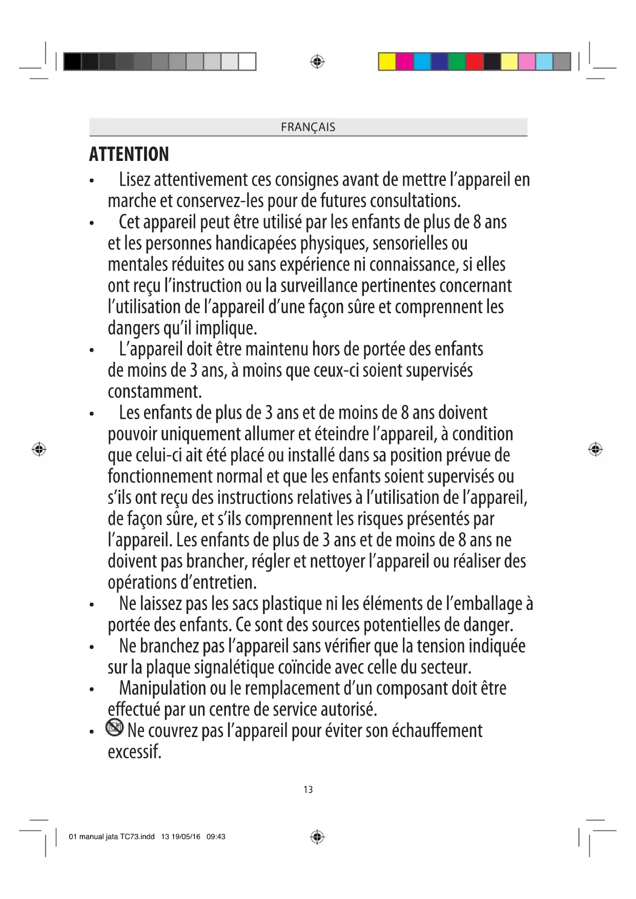 01 manual jata TC73.indd 13 19/05/16 09:4314 PRÉCAUTION: Certaines parties de cet appareil peuvent devenir très chaudes et causer des brûlures. Il faut faire particulièrement attention en cas de présence d’enfants et de personnes vulnérables.