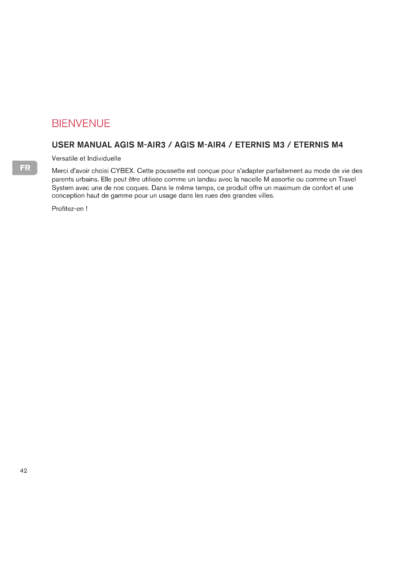 Bienvenue User manUal agis m-air3 / agis m-air4 / eternis m3 / eternis m4 Versatile et Individuelle Merci d’avoir choisi CYBEX. Cette poussette est conçue pour s’adapter parfaitement au mode de vie des parents urbains. Elle peut être utilisée comme un landau avec la nacelle M assortie ou comme un Travel System avec une de nos coques. Dans le même temps, ce produit offre un maximum de confort et une conception haut de gamme pour un usage dans les rues des grandes villes. Profitez-en !43