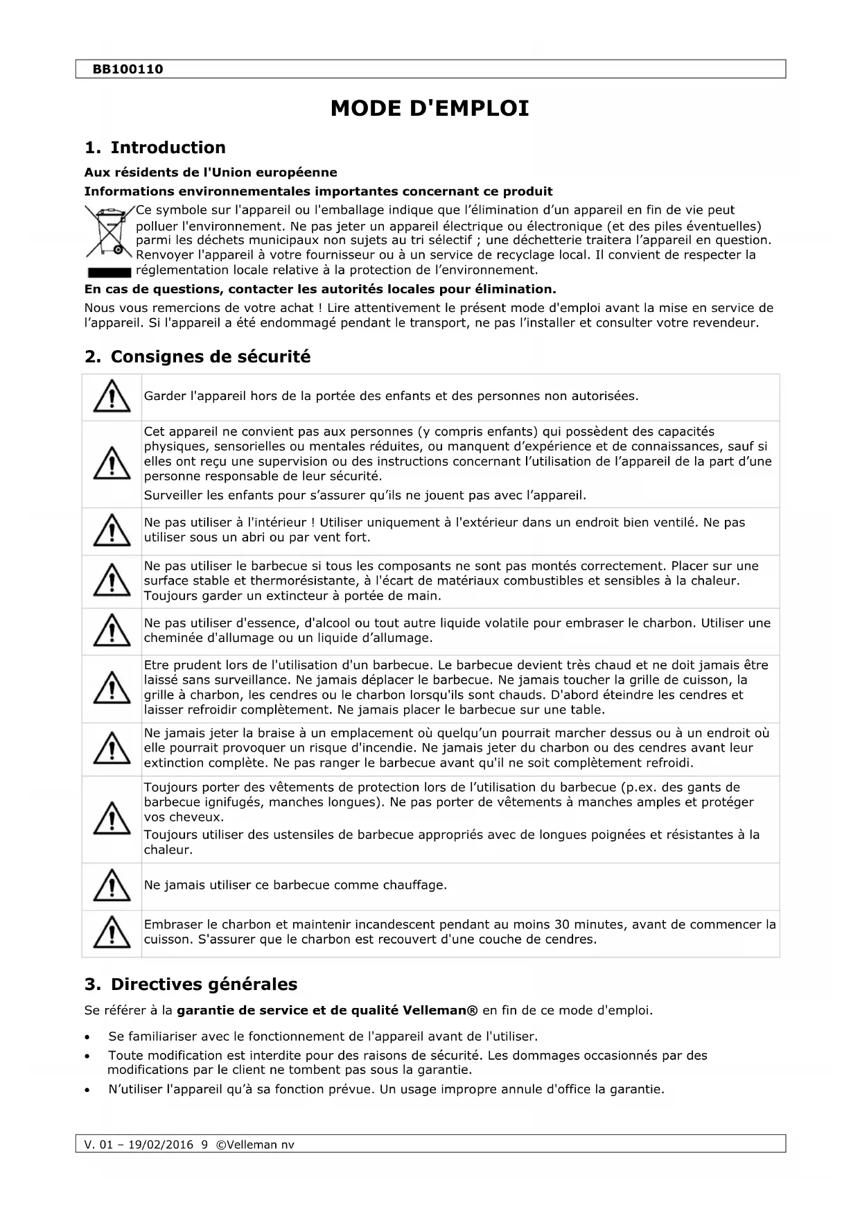 Se référer à la garantie de service et de qualité Velleman® en fin de ce mode d'emploi. Se familiariser avec le fonctionnement de l'appareil avant de l'utiliser. Toute modification est interdite pour des raisons de sécurité. Les dommages occasionnés par des modifications par le client ne tombent pas sous la garantie. N’utiliser l'appareil qu’à sa fonction prévue. Un usage impropre annule d'office la garantie.BB100110