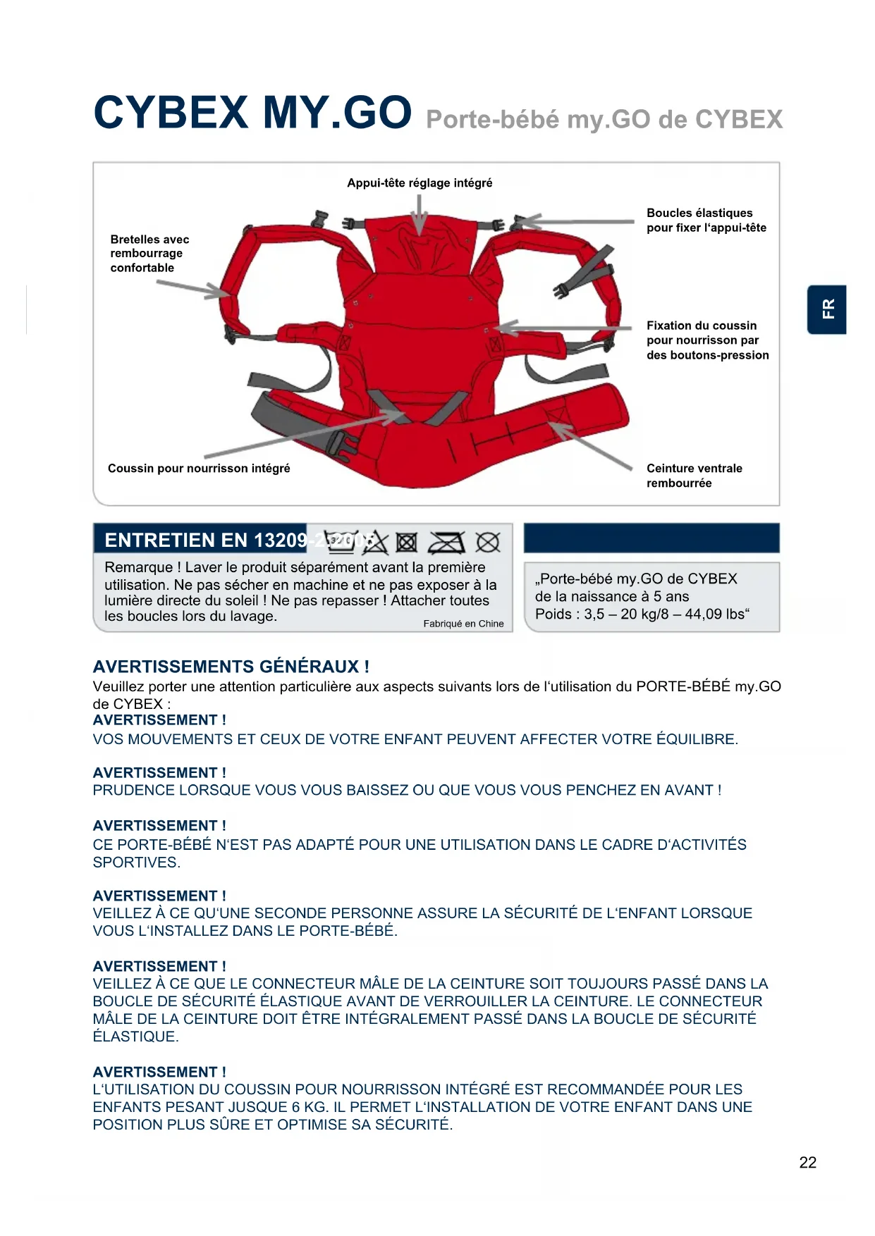 AVERTISSEMENTS GÉNÉRAUX ! AVERTISSEMENT ! AVERTISSEMENT ! AVERTISSEMENT ! AVERTISSEMENT ! AVERTISSEMENT ! AVERTISSEMENT ! VOS MOUVEMENTS ET CEUX DE VOTRE ENFANT PEUVENT AFFECTER VOTRE ÉQUILIBRE.VEILLEZ À CE QU‘UNE SECONDE PERSONNE ASSURE LA SÉCURITÉ DE L‘ENFANT LORSQUE VOUS L‘INSTALLEZ DANS LE PORTE-BÉBÉ.VEILLEZ À CE QUE LE CONNECTEUR MÂLE DE LA CEINTURE SOIT TOUJOURS PASSÉ DANS LA BOUCLE DE SÉCURITÉ ÉLASTIQUE AVANT DE VERROUILLER LA CEINTURE. LE CONNECTEUR MÂLE DE LA CEINTURE DOIT ÊTRE INTÉGRALEMENT PASSÉ DANS LA BOUCLE DE SÉCURITÉ ÉLASTIQUE.L‘UTILISATION DU COUSSIN POUR NOURRISSON INTÉGRÉ EST RECOMMANDÉE POUR LES ENFANTS PESANT JUSQUE 6 KG. IL PERMET L‘INSTALLATION DE VOTRE ENFANT DANS UNE POSITION PLUS SÛRE ET OPTIMISE SA SÉCURITÉ.PRUDENCE LORSQUE VOUS VOUS BAISSEZ OU QUE VOUS VOUS PENCHEZ EN AVANT !CE PORTE-BÉBÉ N‘EST PAS ADAPTÉ POUR UNE UTILISATION DANS LE CADRE D‘ACTIVITÉS SPORTIVES.Veuillez porter une attention particulière aux aspects suivants lors de l‘utilisation du PORTE-BÉBÉ my.GO de CYBEX :Fabriqué en ChineBretelles avec rembourrage confortableAppui-tête réglage intégréBoucles élastiques pour xer l‘appui-têteFixation du coussin pour nourrisson par des boutons-pressionCeinture ventrale rembourrée Coussin pour nourrisson intégré FR23