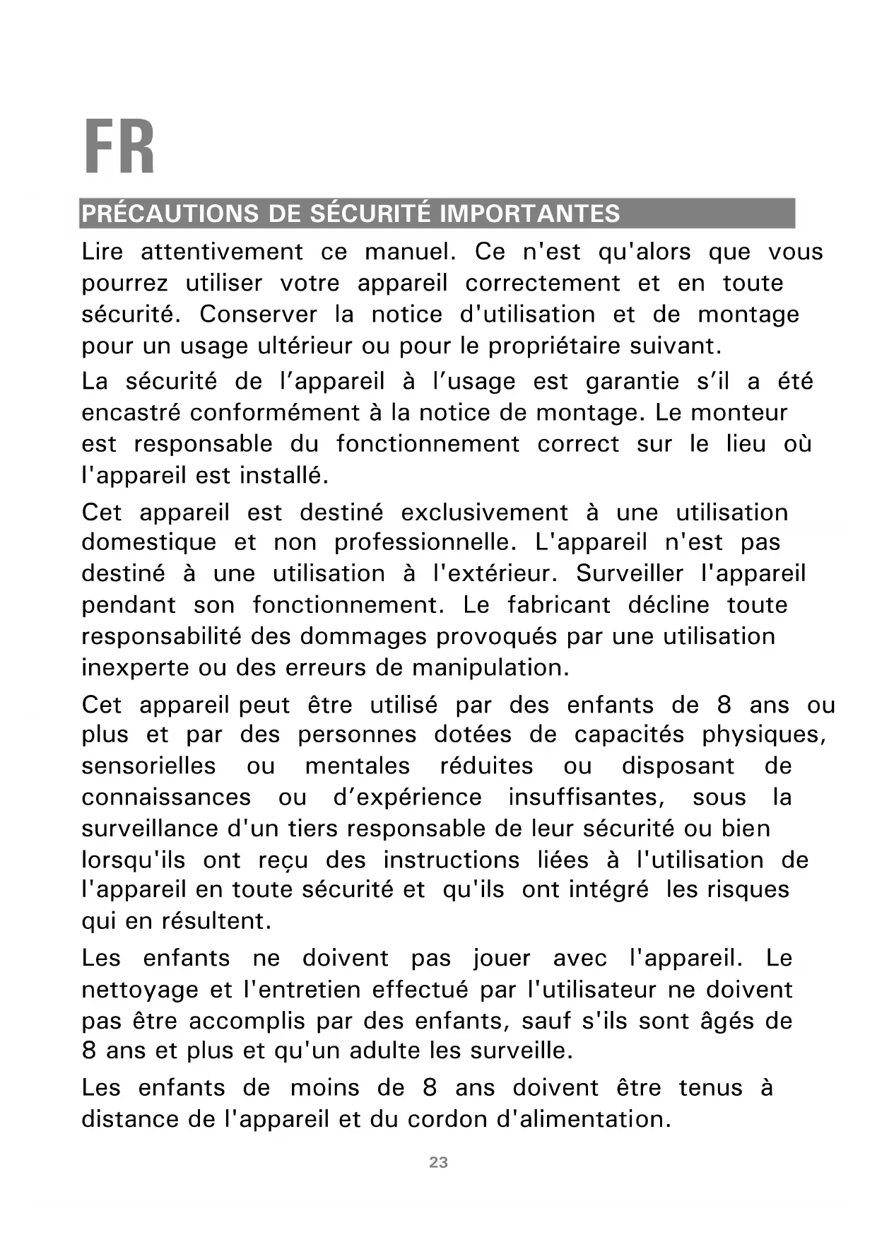 La sécurité de l'appareil à l'utilisation est garantie s'il a été encastré conformément à la notice de montage. Le monteur est responsable du fonctionnement correct sur le lieu où l'appareil est installé.