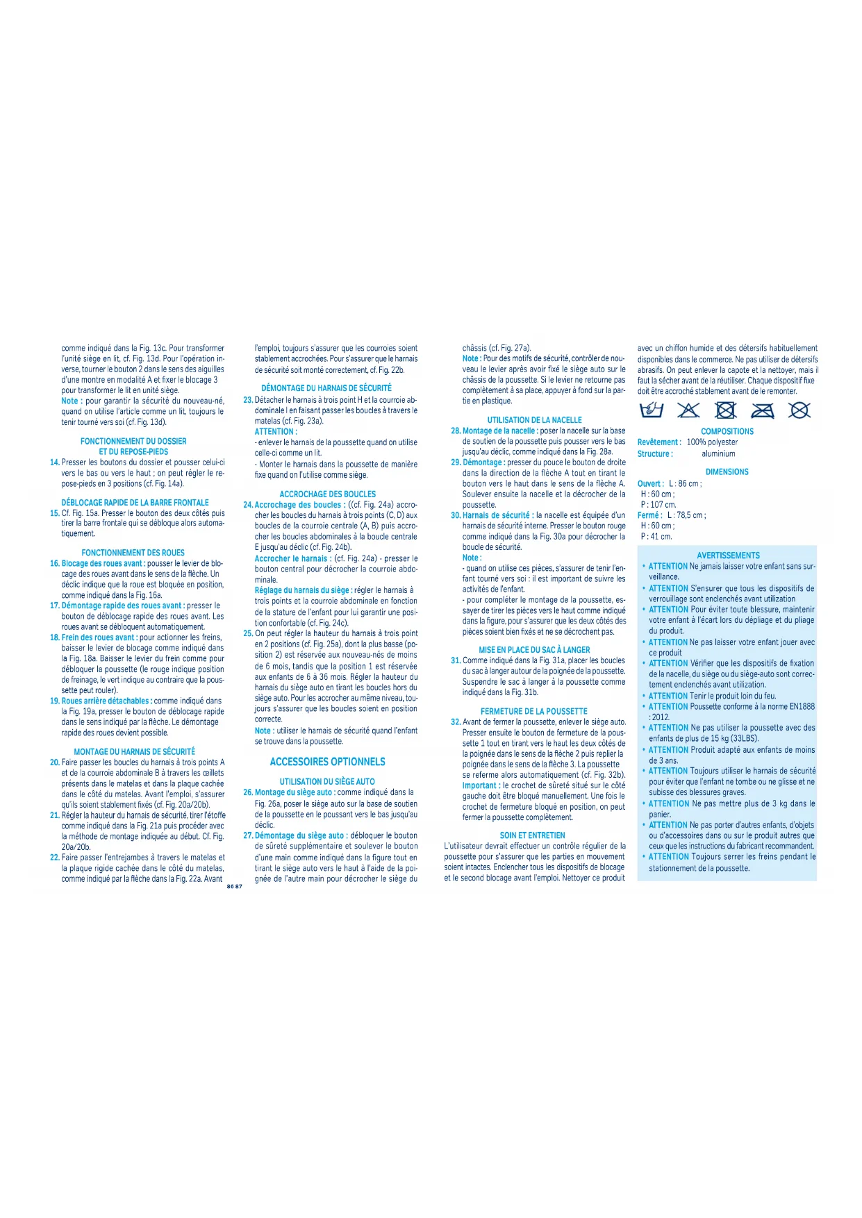 Pour en garantir la sécurité, ce produit requiert des contrôles et un entretien réguliers. En maintenir toutes les parties propres. Si le mouvement de certaines parties se durci, appliquer dessus une couche de lubrifiant sous forme de spray à base de silicone. Partie métalliques, siège et parties en tissu : les nettoyer à l'aide d'un chiffon humidifié avec de l'eau chaude et un détersif délicat puis les sécher. Ne pas utiliser de détersifs abrasifs, à base d'ammoniac, d'eau de javel ou d'alcool. On peut enlever le couvre-jambes et les accessoires pour les nettoyer. On peut enlever la capote en l'extrayant simplement des dispositifs de fixation. Ne pas utiliser de solvants, de détersifs chimiques ou de lubrifiants sur les parties du siège et ne jamais tenter de décolorer ou de teindre le tissu. Ne jamais ranger la nacelle encore humide. Attendre qu'elle soit complètement sèche. Si elle est encore humide, la laisser complètement ouverte dans un endroit chaud et la sécher à l'aide d'un chiffon doux. Ranger la nacelle encore humide risque de provoquer la formation de moisissure. Son utilisation près de la mer risque de provoquer la formation d'incrustations de sel. Nettoyer régulièrement la nacelle à l'aide d'un chiffon doux humidifié avec de l'eau chaude et un détersif délicat. Utiliser la nacelle conformément aux instructions pour éviter tout dommage. Soumettre la nacelle à un entretien général avant de s'en servir pour un second enfant.