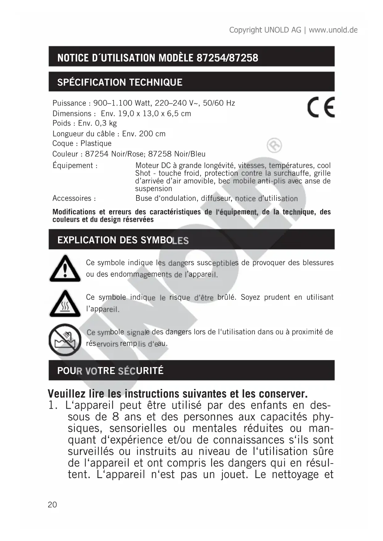 Les défauts de l’appareil qui se produisent malgré l’utilisation correcte suite à une faute de l‘usine et dont nous sommes informés immédiatement après qu’ils soient constatés dans les 24 mois après la livraison aux preneur final, seront réparés gratuitement. Notre garantie n’est valide que pour les appareils vendus en Allemagne et en Autriche. Dans tout autre pays veuillez contacter l’importateur. Veuillez envoyer à notre adresse les appareils, pour lesquels vous réclamez une suppression de défauts, avec le bon d’achat mon- trant la date d’achat, port payé et proprement emballé. Les coûts de transport seront remboursés en cas de garantie en Allemagne et en Autriche. Les défauts causés par usure, utilisation incorrecte ou non-respect des instructions de maintenance sont exclus. Notre obligation de garantie cesse, si de réparations ou des interventions sont accomplies par des tiers. Cette garantie n’affecte pas les droits du consommateur contre le commerçant. TRAITEMENT DES DÉCHETS / PROTECTION DE L’ENVIRONNEMENT Nos appareils sont produits selon un standard élevé de qualité pour une longue durée d’utilisation. Un entretien régulier et des réparations compétentes par notre service après-vente prolongent cette durée d’utilisation. Si néanmoins l’appareil est endommagé et ne peut plus être réparé, veuillez suivre les instructions suivantes. Ne jamais disposer ce produit avec les dégâts de ménage. Apportez ce produit à une station de collection pour récupération de produits électriques et électroniques. Par la collection séparée vous aidez à protéger les ressources naturelles et prenez soin, que le produit est démonté sans risque pour la santé et l’environnement. Copyright UNOLD AG | www.unold.de26 Vermogen: 900–1.100 Watt, 220–240 V~, 50/60 Hz Afmetingen: Ca. 19,0 x 13,0 x 6,5 cm Gewicht: Ca. 0,3 kg Kabellengte: Ca. 200 cm Behuizing: Kunststof Kleuren: 87254 Zwart/Rose; 87258 Zwart/Blauw Uitvoering: Duurzame DC-motor, 2 blaasstanden, cold Shot-functie/koudstand, oververhittingsbeveiliging, , knikbescherming met ophangoog Toebehoren: Onduleermondstuk, diffusor, gebruiksaanwijzing Wijzigingen en vergissingen in de uitrustingskenmerken, techniek, kleuren en design voorbehouden GEBRUIKSAANWIJZING MODEL 87254/87258