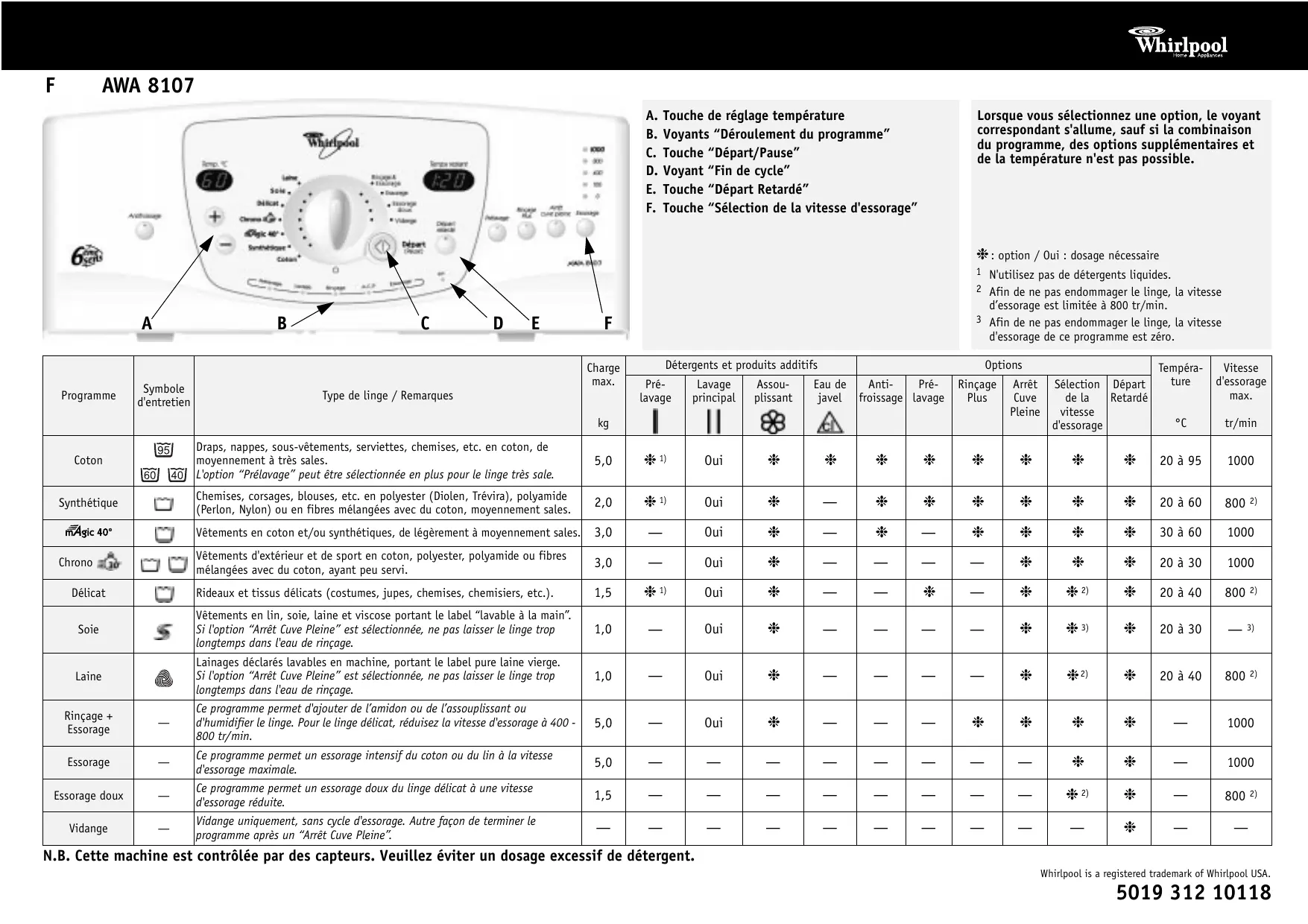 AWA 8107 - TABLEAU DE PROGRAMMES - Lave-linge WHIRLPOOL - Notice d'utilisation et mode d'emploi gratuit