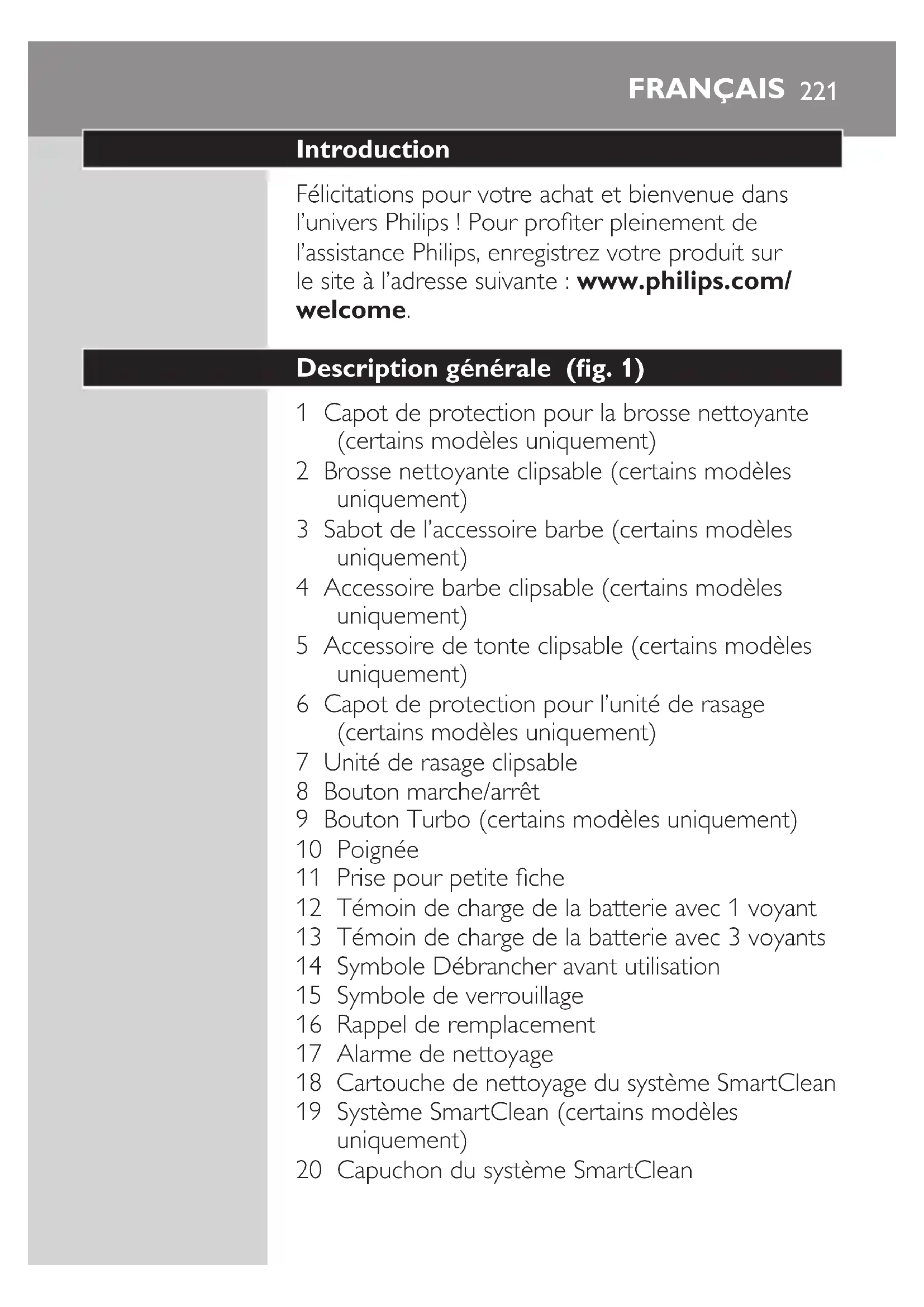 Nettoyez soigneusement l’accessoire après utilisation (voir le chapitre « Nettoyage et entretien »). Utilisation de la brosse nettoyante Utilisez la brosse nettoyante rotative avec votre crème nettoyante quotidienne. La brosse nettoyante supprime l’huile et la saleté, contribuant à une peau saine et exempte d’huile. 1 Insérez la languette de l’accessoire dans la fente située sur la partie supérieure de l’appareil. Fixez ensuite l’accessoire sur l’appareil en le poussant vers le bas (clic). 2 Humidiez l’accessoire avec de l’eau. N’utilisez pas l’appareil avec une tête de brosse sèche car cela pourrait irriter la peau. Conseil : Utilisez l’accessoire avant le rasage pour un rasage plus facile et un résultat plus hygiénique. FRANÇAIS 2353 Humidiez votre visage avec de l’eau et appliquez un produit nettoyant sur votre visage. 4 Placez l’accessoire sur votre joue droite. 5 Allumez l’appareil. 6 Déplacez doucement l’accessoire sur votre peau du nez vers l’oreille. N’appuyez pas l’accessoire trop fortement sur la peau an que le nettoyage reste agréable. 7 Au bout d’environ 20 secondes, vous pouvez déplacer l’accessoire vers votre joue gauche et commencer à nettoyer cette partie de votre visage. Attention : Ne nettoyez pas la zone sensible autour de vos yeux. 8 Au bout d’environ 20 secondes, vous pouvez déplacer l’accessoire vers votre front et commencer à nettoyer cette partie de votre visage. Déplacez doucement l’accessoire de gauche à droite. Remarque : Nous vous conseillons de ne pas exagérer le nettoyage et de ne pas nettoyer une zone pendant plus de 20 secondes. 20 sec. 20 sec. 20 sec. FRANÇAIS2369 Après l’utilisation, rincez et séchez votre visage. Votre visage est maintenant prêt pour la prochaine étape de vos soins quotidiens. 10 Nettoyez soigneusement l’accessoire après utilisation (voir le chapitre « Nettoyage et entretien »). Nettoyage et entretien Remarque : Les accessoires fournis peuvent varier selon les différents produits. L’emballage indique les accessoires qui ont été fournis avec votre appareil. Nettoyage du rasoir dans le système SmartClean (certains modèles uniquement) N’inclinez pas le système SmartClean pour éviter les fuites. Remarque : Tenez le système SmartClean tandis que vous le préparez pour utilisation. Remarque : Si vous nettoyez le rasoir dans le système SmartClean une fois par semaine, la cartouche SmartClean durera environ trois mois. Préparation du système SmartClean pour utilisation 1 Branchez la petite che au dos du système SmartClean. 2 Branchez l’adaptateur sur la prise secteur. FRANÇAIS 2373 Appuyez sur le bouton latéral du système SmartClean et soulevez le haut du système SmartClean. 4 Enlevez la protection hermétique de la cartouche de nettoyage. 5 Placez la cartouche de nettoyage dans le système SmartClean. 6 Remettez en place le haut du système SmartClean en appuyant dessus (clic). Utilisation du système SmartClean Veillez toujours à évacuer l’excès d’eau du rasoir avant de l’installer dans le système SmartClean.
