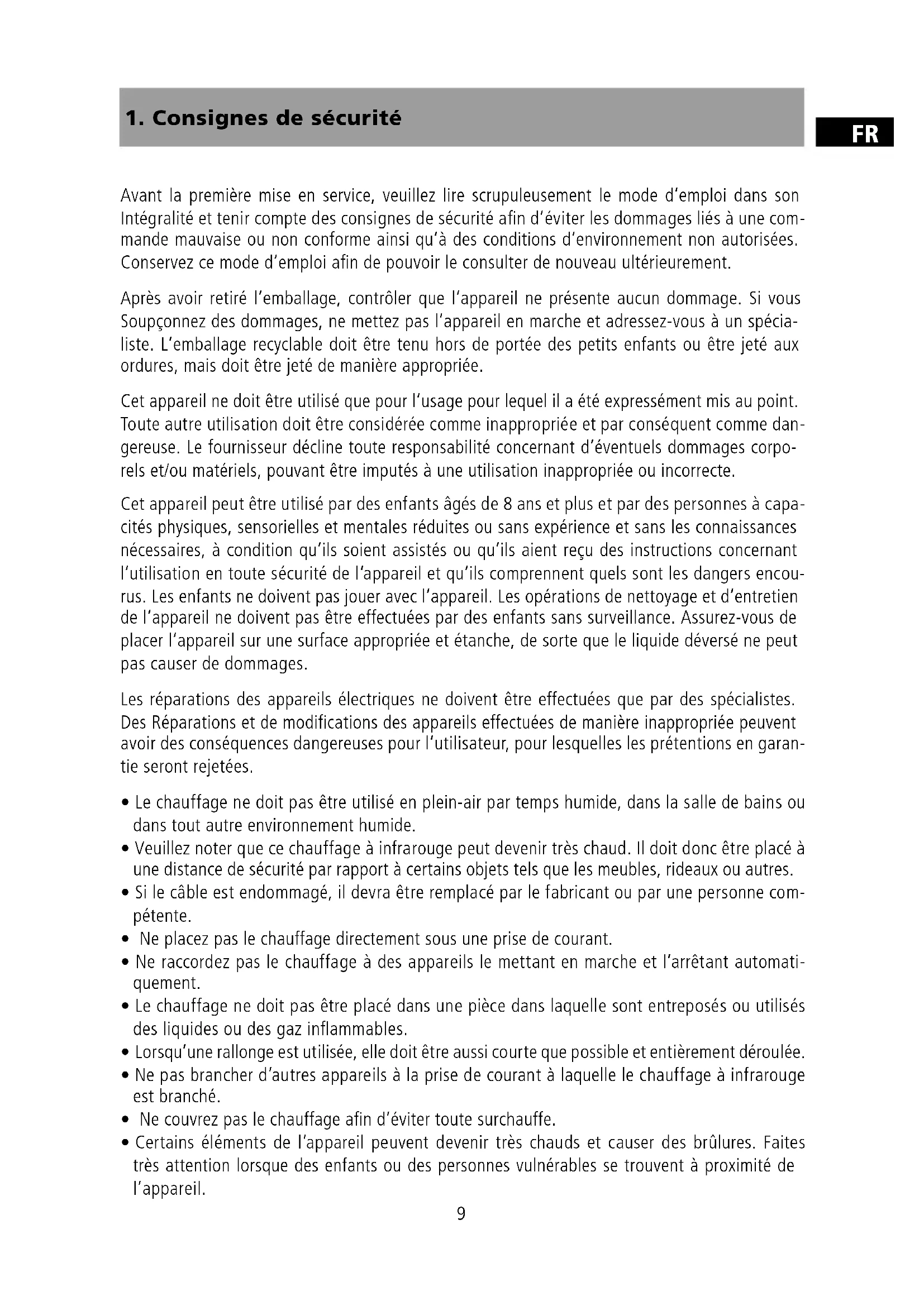 • Veuillez noter que ce chauffage à infrarouge peut devenir très chaud. Il doit donc être placé à une distance de sécurité par rapport à certains objets tels que les meubles, rideaux ou autres.