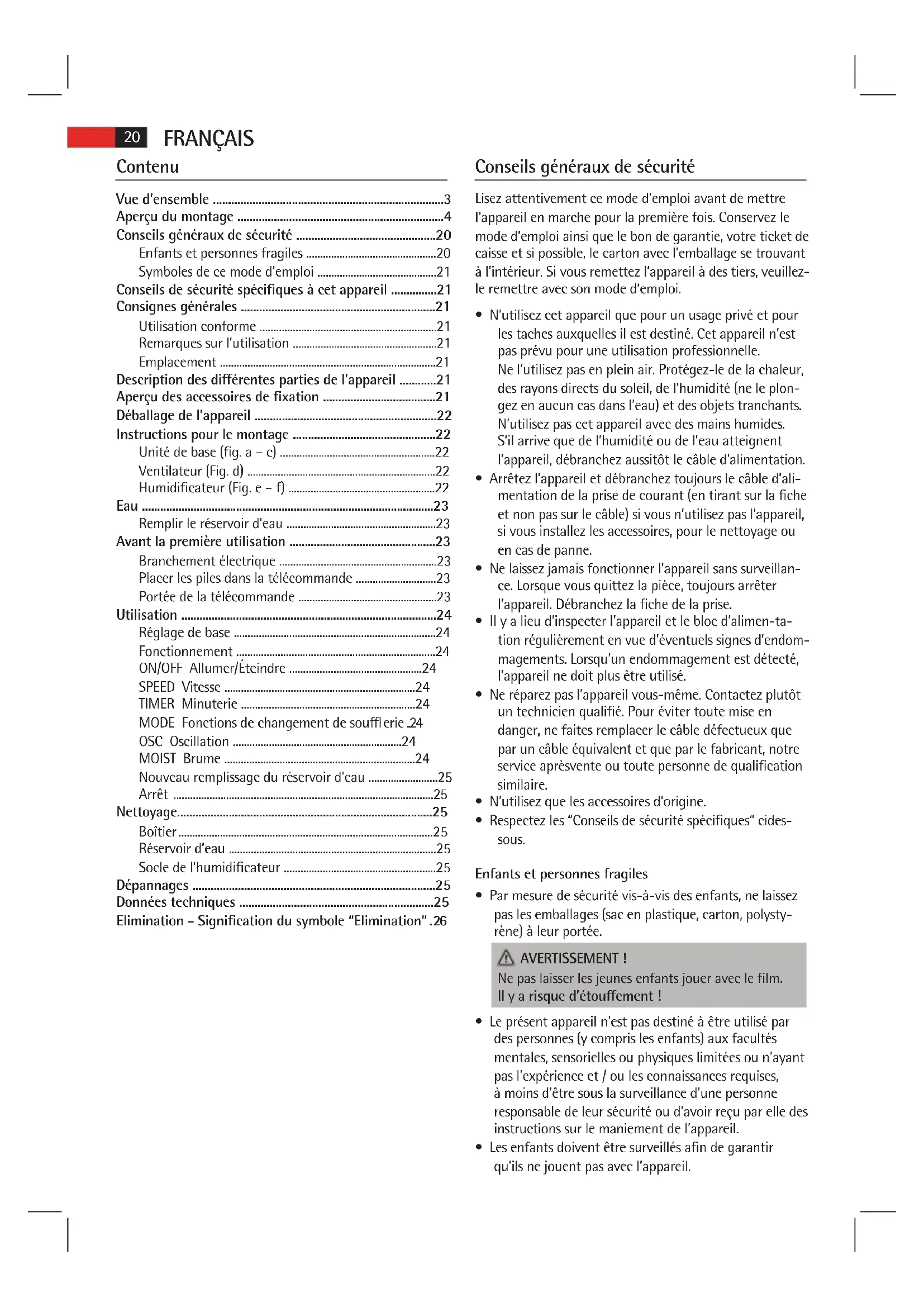 - Ne pas poser l’appareil à proximité directe de fours ou d’autres sources de chaleur. ATTENTION : L’humidicateur intégré fonctionne par ultrasons. Ce son peut gêner les animaux de compagnie. Consignes générales Utilisation conforme Cet appareil peut s’utiliser comme ventilateur et/ou humi- dicateur. Il est destiné uniquement à cet usage à l’exclusion de toute autre utilisation. Son utilisation est réservée au seul mode décrit dans la notice d’emploi. Vous ne devez pas exploiter l’appareil à des ns commer- ciales. Toute autre utilisation est considérée comme non confor- me et risque de provoquer des dommages maté-riels voire même des blessures. La ETV - Elektro-Technische Vertriebsgesellschaft mbH décline toute responsabilité pour les dommages résultant d’une utilisation non conforme. Remarques sur l’utilisation Utilisez cet appareil pour augmenter l’humidité de l’air dans un environnement sec. Voici les avantages acquis :