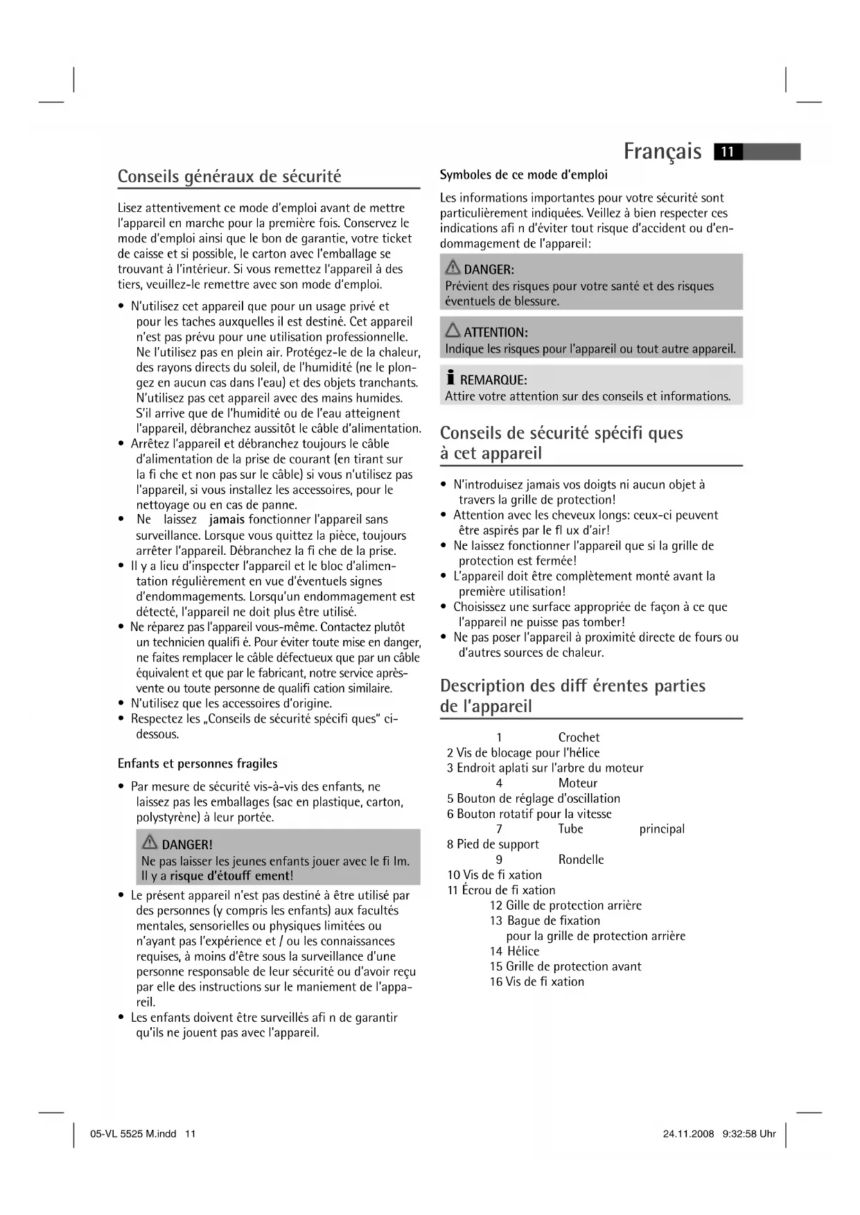 - Ne pas poser l’appareil à proximité directe de fours ou d’autres sources de chaleur. Description des di érentes parties de l’appareil 1 Crochet 2 Vis de blocage pour l’hélice 3 Endroit aplati sur l’arbre du moteur 4 Moteur 5 Bouton de réglage d’oscillation 6 Bouton rotatif pour la vitesse 7 Tube principal 8 Pied de support 9 Rondelle 10 Vis de xation 11 Écrou de xation 12 Gille de protection arrière 13 Bague de xation pour la grille de protection arrière 14 Hélice 15 Grille de protection avant 16 Vis de xation 05-VL 5525 M.indd 1105-VL 5525 M.indd 11 24.11.2008 9:32:58 Uhr24.11.2008 9:32:58 UhrFrançais