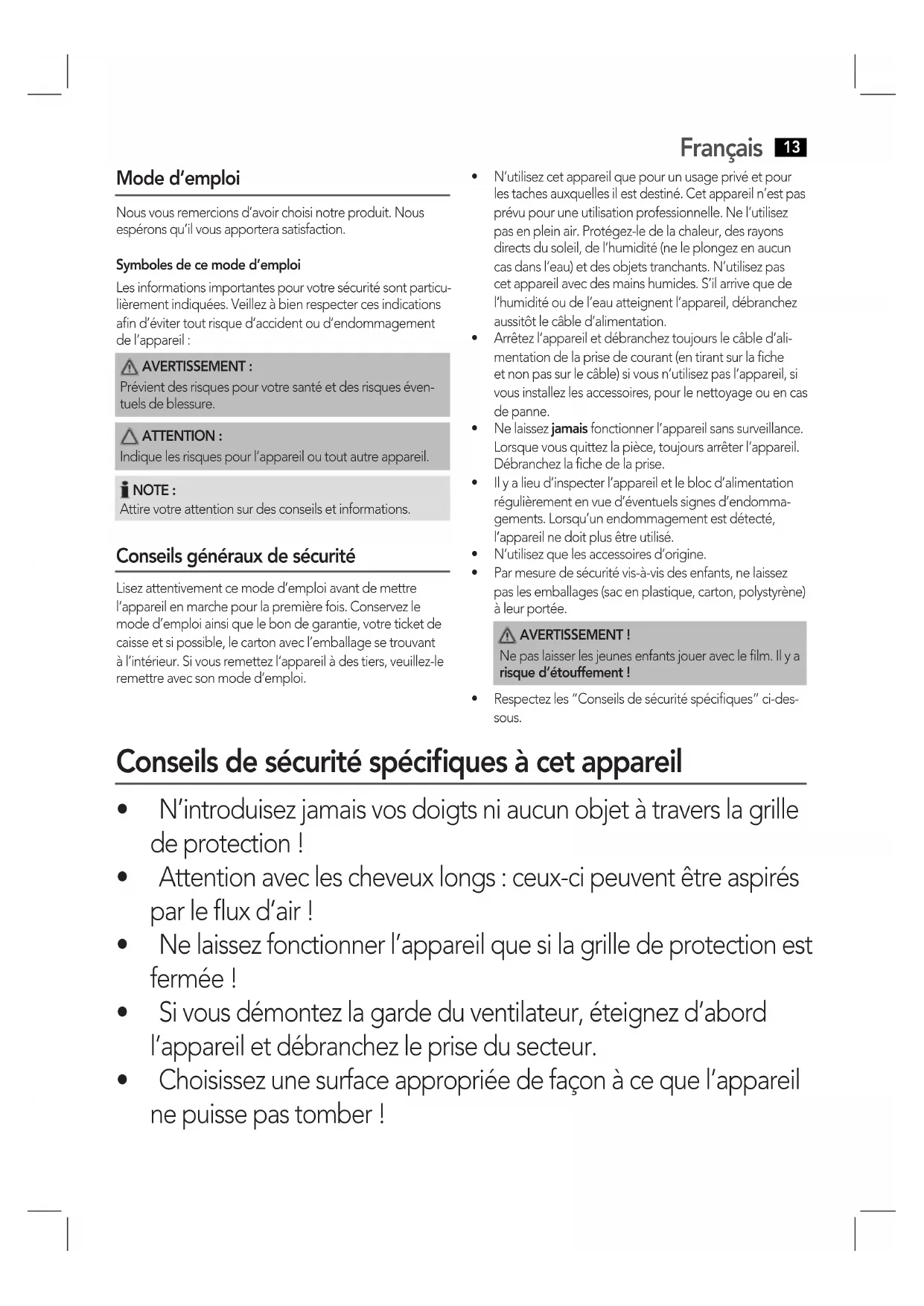 - Nelaissezfonctionnerl’appareilquesilagrilledeprotectionest fermée !