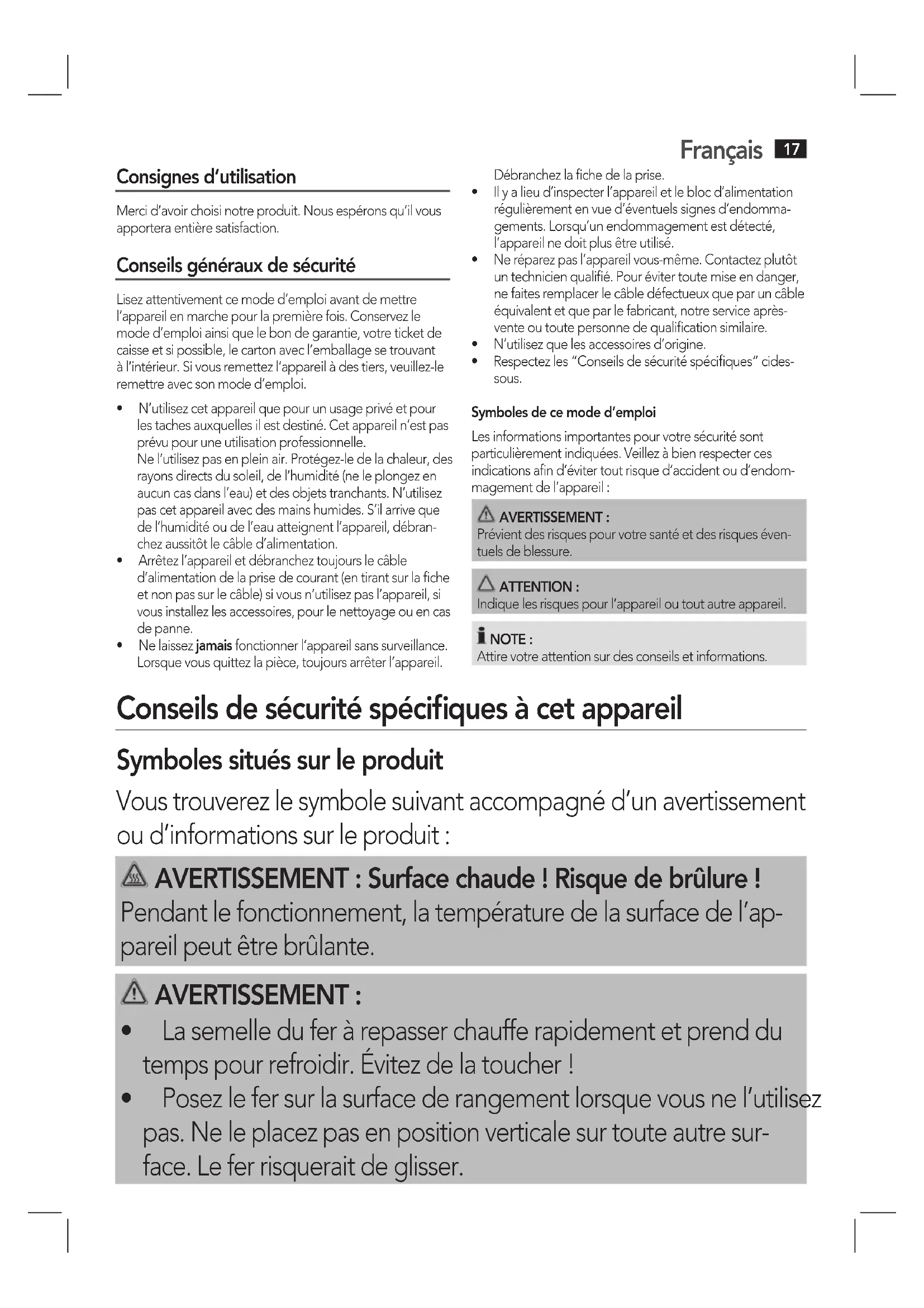 AVERTISSEMENT : Surface chaude ! Risque de brûlure !