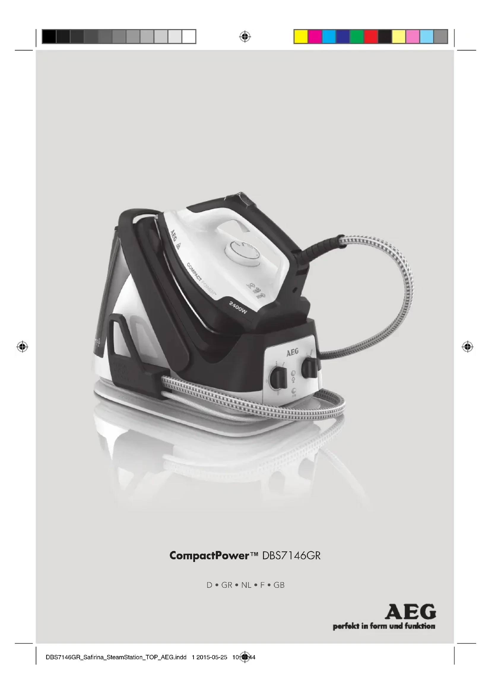 - Avertissement! Avant de procéder au nettoyage, débranchez toujours l’appareil de la prise secteur et laissez refroidir le fer sur sa base. L’appareil est conforme à la directive 2006/95/CE et à la directive EMC 2004/108/CE. CONSERVEZ CES INSTRUCTIONS ET RESPECTEZ-LES. DBS7146GR_Safirina_SteamStation_TOP_AEG.indd 7 2015-05-25 10:16:468