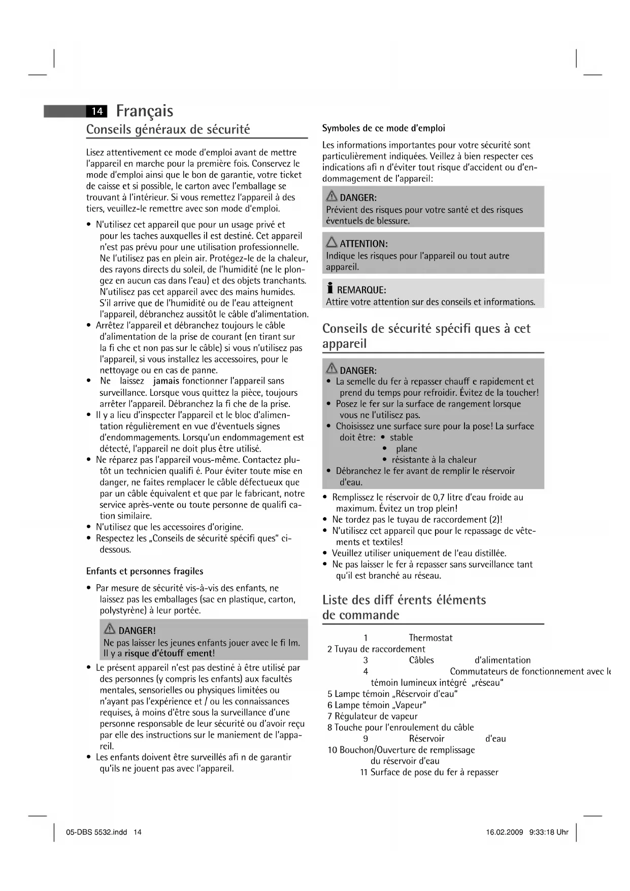 - Ne pas laisser le fer à repasser sans surveillance tant qu‘il est branché au réseau. Liste des di érents éléments de commande 1 Thermostat 2 Tuyau de raccordement 3 Câbles d‘alimentation 4 Commutateurs de fonctionnement avec leur témoin lumineux intégré „réseau“ 5 Lampe témoin „Réservoir d’eau“ 6 Lampe témoin „Vapeur“ 7 Régulateur de vapeur 8 Touche pour l’enroulement du câble 9 Réservoir d’eau 10 Bouchon/Ouverture de remplissage du réservoir d’eau 11 Surface de pose du fer à repasser 05-DBS 5532.indd 1405-DBS 5532.indd 14 16.02.2009 9:33:18 Uhr16.02.2009 9:33:18 UhrFrançais