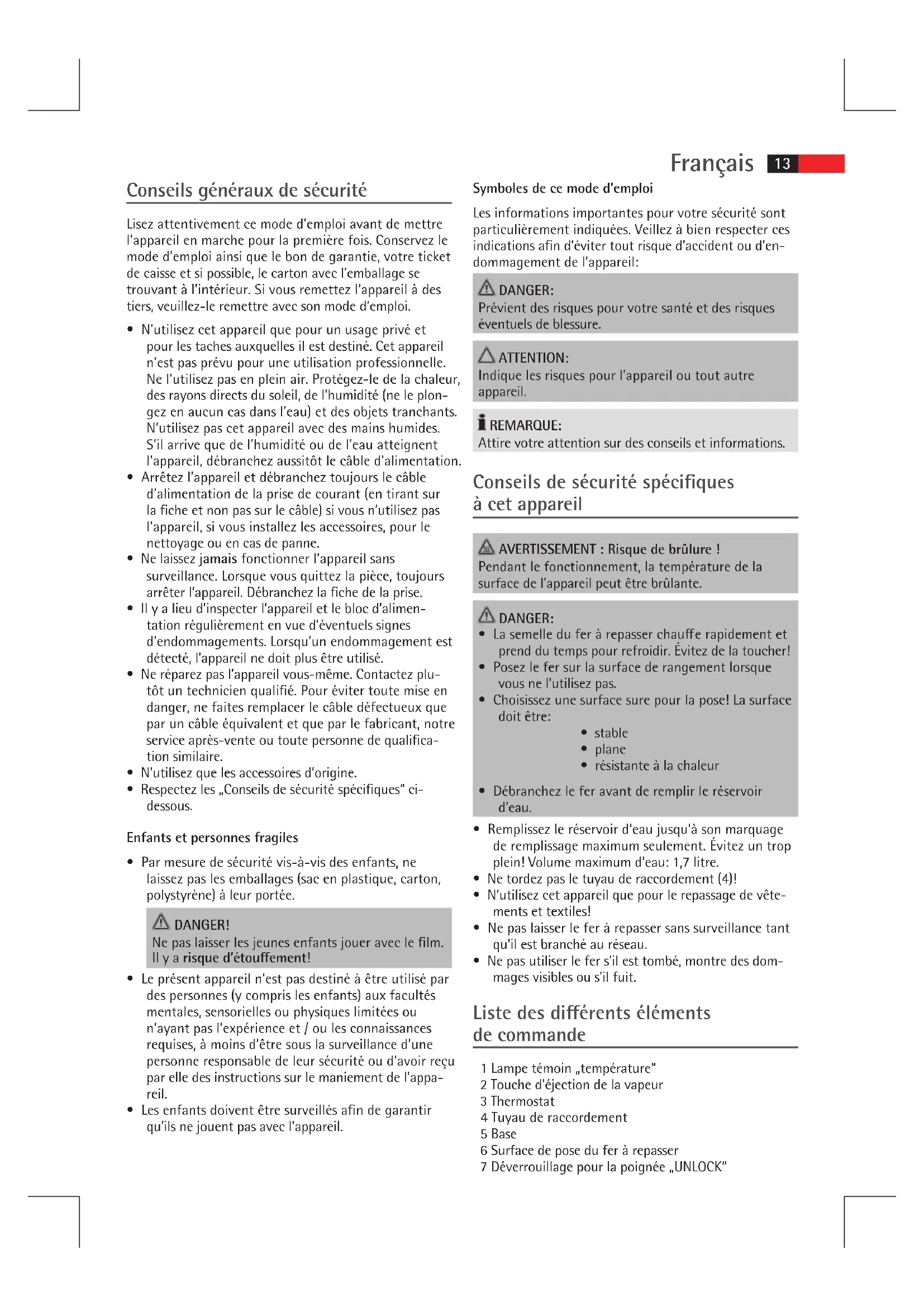- Respectez les „Conseils de sécurité spéciques“ ci- dessous. Enfants et personnes fragiles