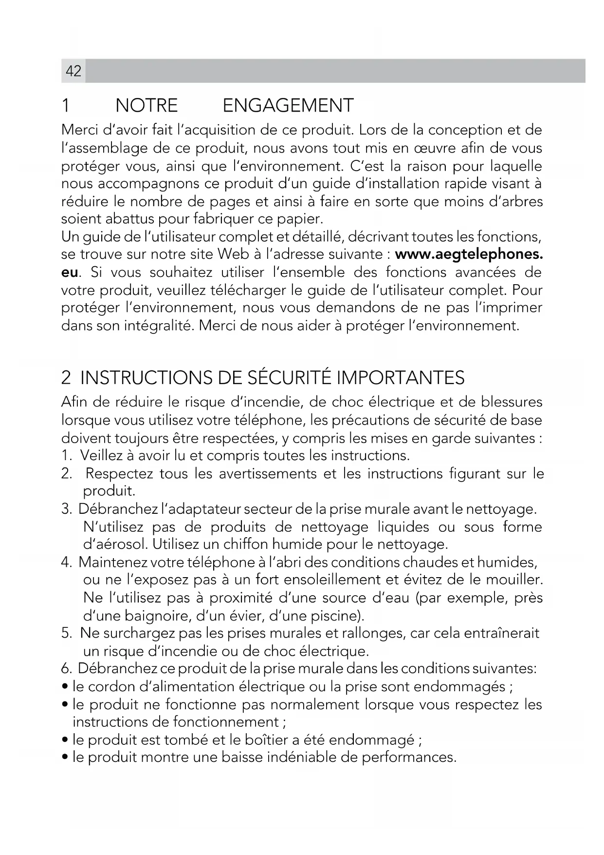Si l‘unité n‘est plus sous garantie, contactez-nous via www.aegtelephones.eu. Ce produit fonctionne uniquement avec des piles rechargeables. Si vous insérez des piles non rechargeables dans le combiné et que vous le placez sur la base, le combiné sera endommagé et ces dommages ne sont PAS couverts par la garantie.61