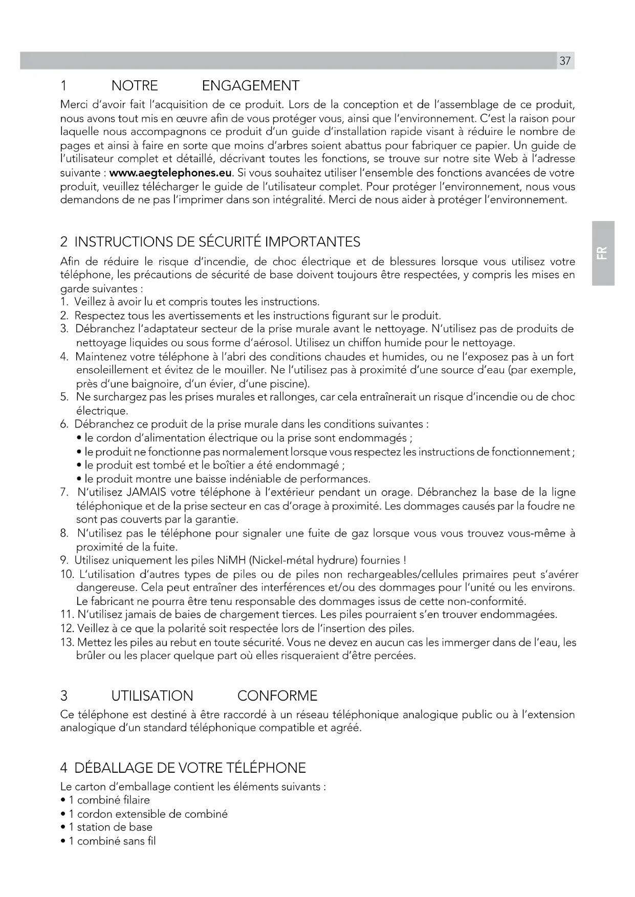 1 NOTRE ENGAGEMENT Merci d‘avoir fait l‘acquisition de ce produit. Lors de la conception et de l‘assemblage de ce produit, nous avons tout mis en œuvre afin de vous protéger vous, ainsi que l‘environnement. C‘est la raison pour laquelle nous accompagnons ce produit d‘un guide d‘installation rapide visant à réduire le nombre de pages et ainsi à faire en sorte que moins d‘arbres soient abattus pour fabriquer ce papier. Un guide de l‘utilisateur complet et détaillé, décrivant toutes les fonctions, se trouve sur notre site Web à l‘adresse suivante : www.aegtelephones.eu. Si vous souhaitez utiliser l‘ensemble des fonctions avancées de votre produit, veuillez télécharger le guide de l‘utilisateur complet. Pour protéger l‘environnement, nous vous demandons de ne pas l‘imprimer dans son intégralité. Merci de nous aider à protéger l‘environnement.