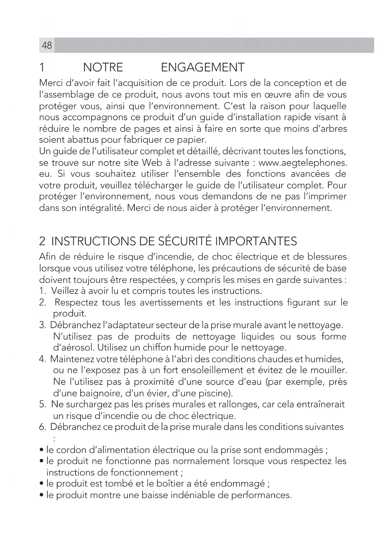 Reinigen Sie keine Teile Ihres Telefons mit Benzin, Verdünnungsmitteln oder Chemikalien auf Lösungsmittelbasis, da dies zu bleibenden Schäden führen kann, die nicht von der Garantie abgedeckt werden. Reinigen Sie das Gerät, falls notwendig, mit einem feuchten Tuch. Halten Sie Ihr Telefon von Hitze, Feuchtigkeit/Nässe oder starker Sonneneinstrahlung fern.48 1 NOTRE ENGAGEMENT Merci d‘avoir fait l‘acquisition de ce produit. Lors de la conception et de l‘assemblage de ce produit, nous avons tout mis en œuvre afin de vous protéger vous, ainsi que l‘environnement. C‘est la raison pour laquelle nous accompagnons ce produit d‘un guide d‘installation rapide visant à réduire le nombre de pages et ainsi à faire en sorte que moins d‘arbres soient abattus pour fabriquer ce papier. Un guide de l‘utilisateur complet et détaillé, décrivant toutes les fonctions, se trouve sur notre site Web à l‘adresse suivante : www.aegtelephones. eu. Si vous souhaitez utiliser l‘ensemble des fonctions avancées de votre produit, veuillez télécharger le guide de l‘utilisateur complet. Pour protéger l‘environnement, nous vous demandons de ne pas l‘imprimer dans son intégralité. Merci de nous aider à protéger l‘environnement.