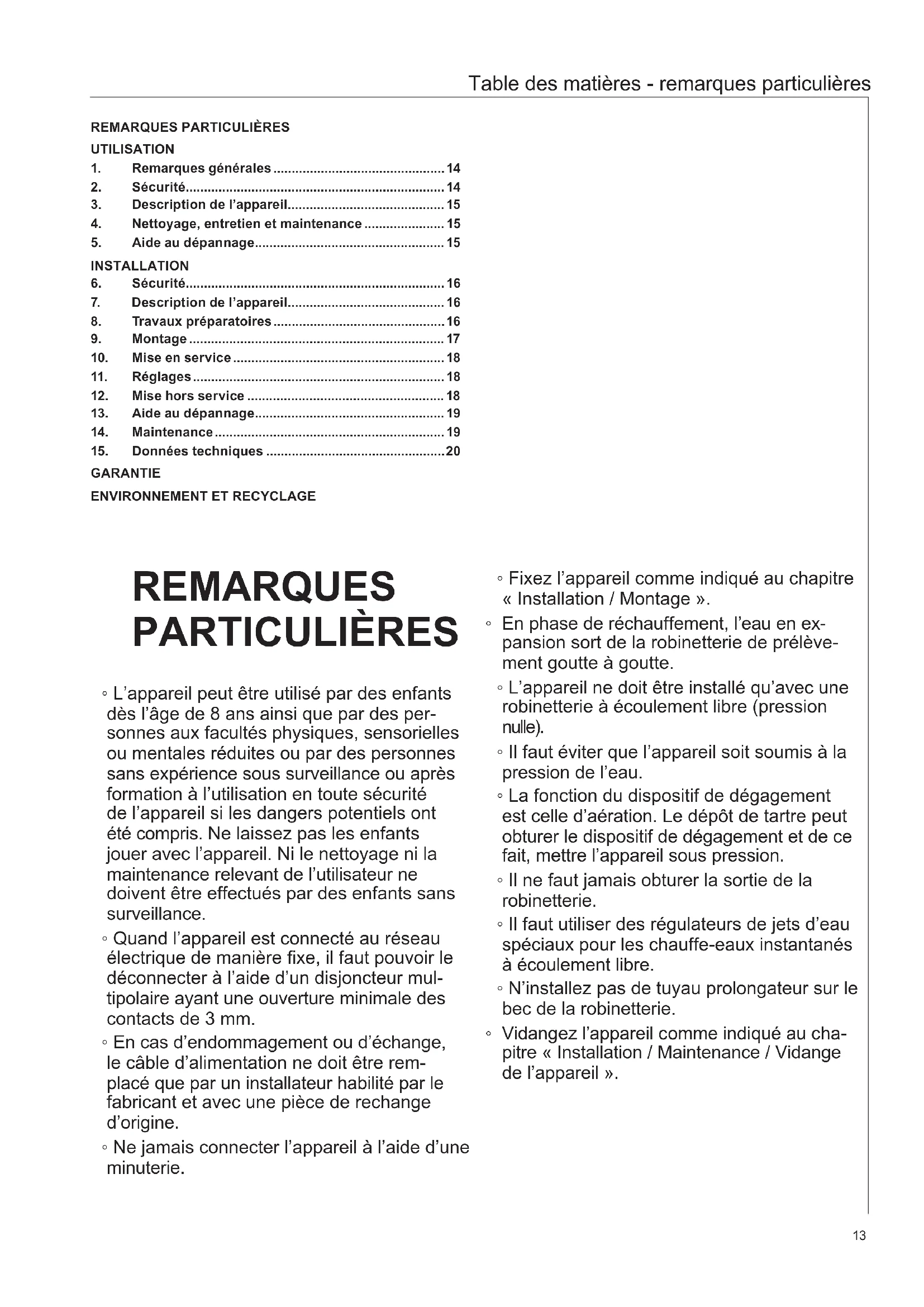 - L’appareil ne doit être installé qu’avec une robinetterie à écoulement libre (pression nulle).
