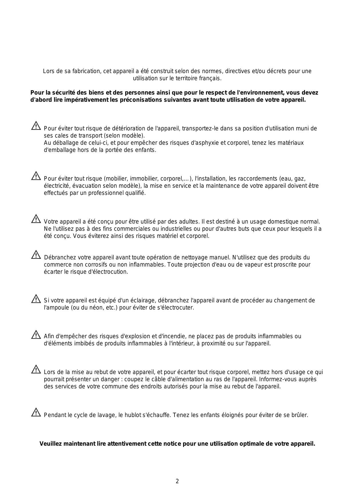 Pour la sécurité des biens et des personnes ainsi que pour le respect de l'environnement, vous devez d'abord dire impératifement les préconisations suivantes avant toute utilisation de votre apparéil.