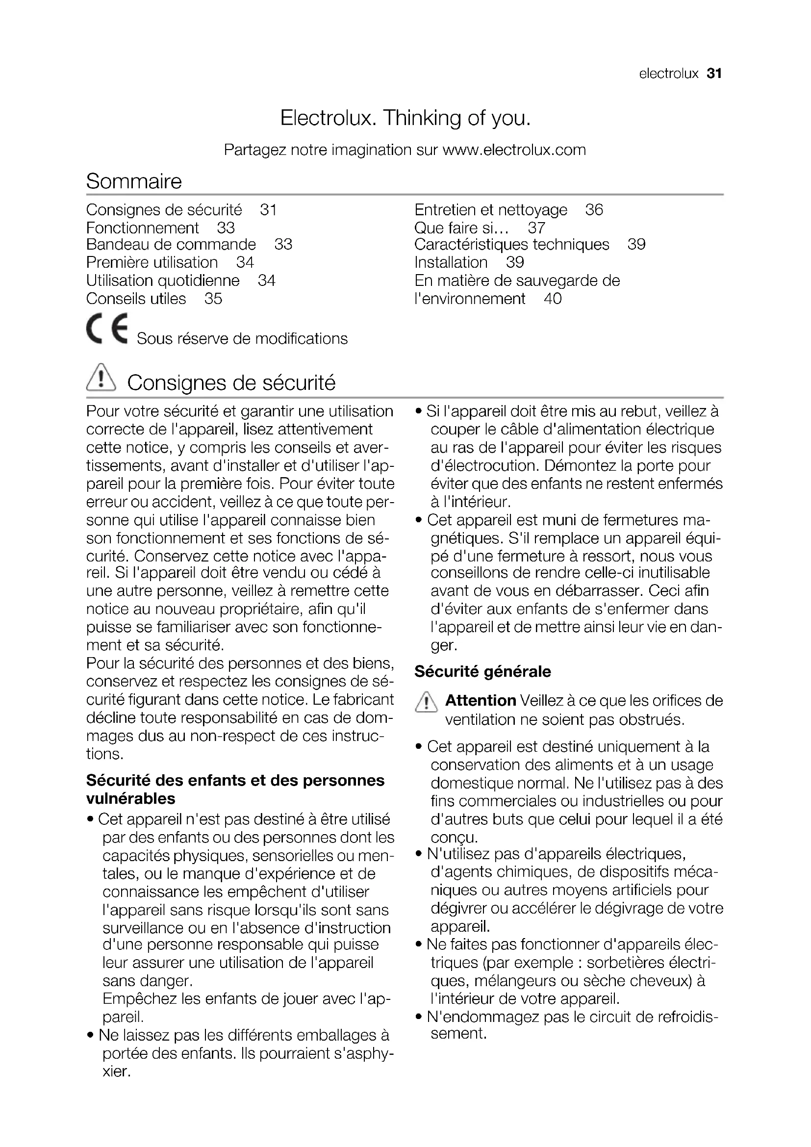 vien seinien välinen rako on 5 cm. Ilmanvaihdon on oltava riittävä laitteen taka- na. Ympäristönsuojelu Tuotteeseen tai sen pakkaukseen merkitty symboli , osoittaa, että tätä tuotetta ei saa laittaa sekajätteen joukkoon, vaan se on toimitettava erilliseen sähkö- ja elektroniikkajätteiden keräyspisteeseen. Asianmukaisella jätehuollolla estetään mahdolliset ympäristö- ja terveyshaitat. Laitetta ei saa purkaa ennen jätehuoltoon luovuttamista eikä laitteen sisälle saa laittaa muita jätteitä. Tarkempia tietoja tämän tuotteen kierrättämisestä saat kuntasi jäteasioita hoitavalta viranomaiselta, liikkeestä josta tuote on ostettu tai internet sivuiltamme www.electrolux.fi. 30 electroluxElectrolux. Thinking of you. Partagez notre imagination sur www.electrolux.com Sommaire Consignes de sécurité 31 Fonctionnement 33 Bandeau de commande 33 Première utilisation 34 Utilisation quotidienne 34 Conseils utiles 35 Entretien et nettoyage 36 Que faire si… 37 Caractéristiques techniques 39 Installation 39 En matière de sauvegarde de l'environnement 40 Sous réserve de modifications Consignes de sécurité Pour votre sécurité et garantir une utilisation correcte de l'appareil, lisez attentivement cette notice, y compris les conseils et aver- tissements, avant d'installer et d'utiliser l'ap- pareil pour la première fois. Pour éviter toute erreur ou accident, veillez à ce que toute per- sonne qui utilise l'appareil connaisse bien son fonctionnement et ses fonctions de sé- curité. Conservez cette notice avec l'appa- reil. Si l'appareil doit être vendu ou cédé à une autre personne, veillez à remettre cette notice au nouveau propriétaire, afin qu'il puisse se familiariser avec son fonctionne- ment et sa sécurité. Pour la sécurité des personnes et des biens, conservez et respectez les consignes de sé- curité figurant dans cette notice. Le fabricant décline toute responsabilité en cas de dom- mages dus au non-respect de ces instruc- tions. Sécurité des enfants et des personnes vulnérables