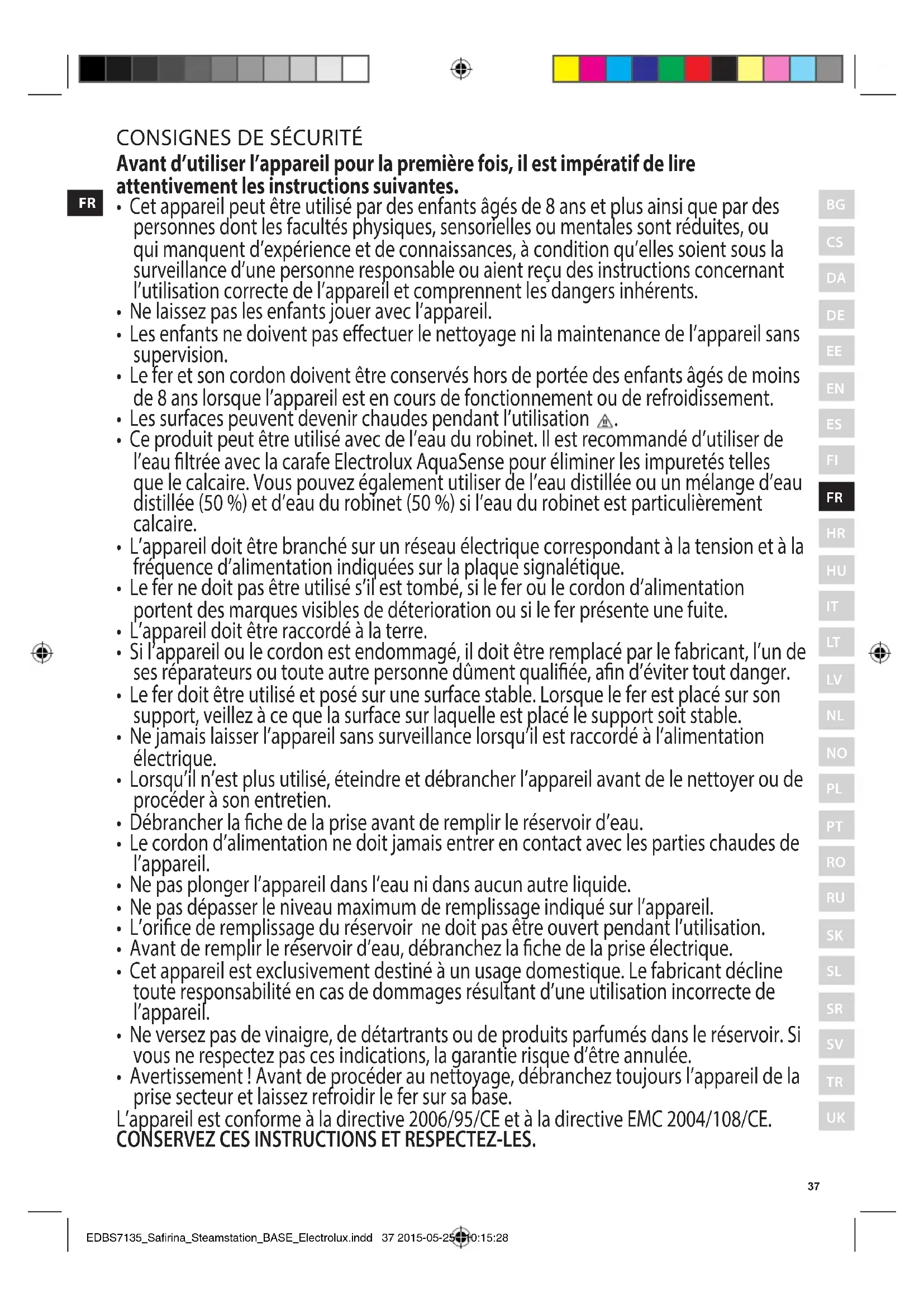 - Avertissement! Avant de procéder au nettoyage, débranchez toujours l’appareil de la prise secteur et laissez refroidir le fer sur sa base. L’appareil est conforme à la directive 2006/95/CE et à la directive EMC 2004/108/CE. CONSERVEZ CES INSTRUCTIONS ET RESPECTEZ-LES.