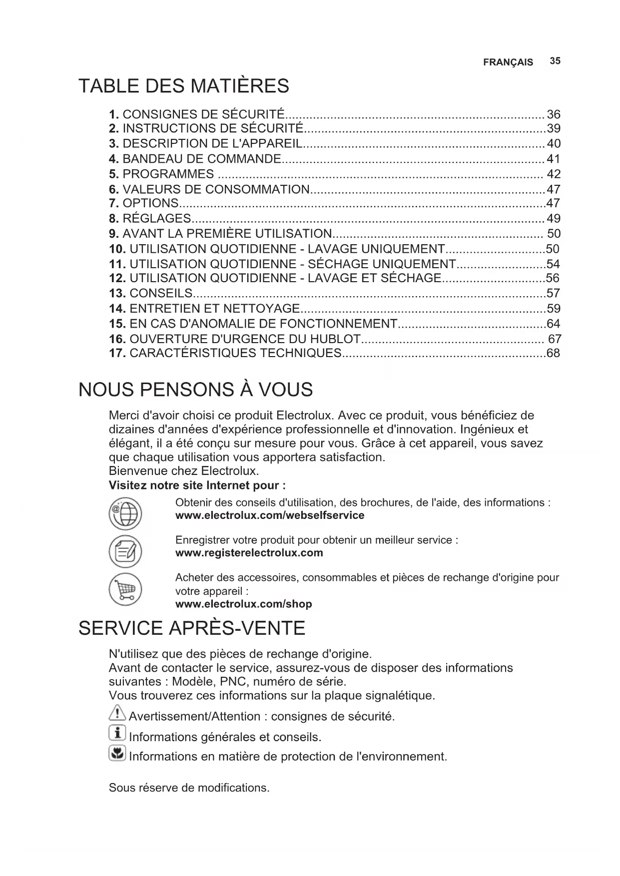 N'utilisez que des pièces de rechange d'origine. Avant de contacter le service, assurez-vous de disposer des informations suivantes : Modèle, PNC, numéro de série. Vous trouverez ces informations sur la plaque signalétique. Avertissement/Attention : consignes de sécurité. Informations générales et conseils. Informations en matière de protection de l'environnement. Sous réserve de modifications. FRANÇAIS