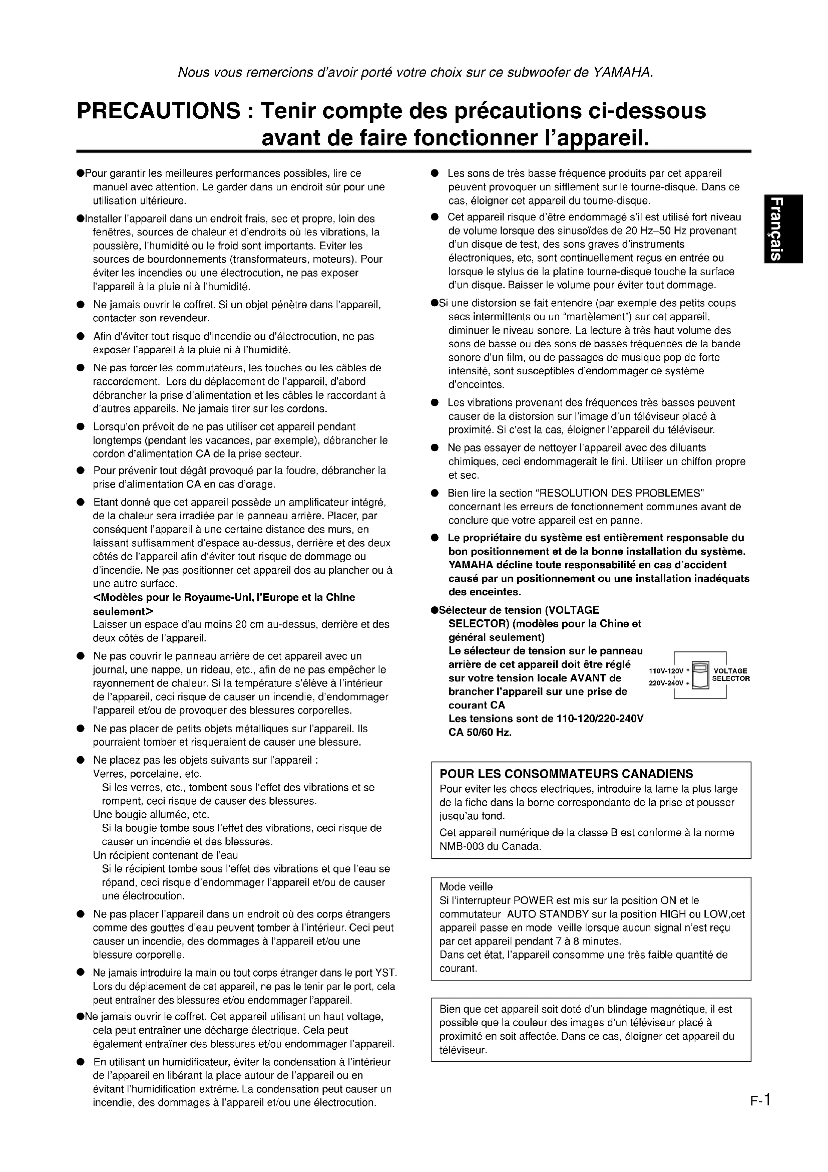 La théorie de l’Active Servo Technology Yamaha repose sur deux principes : la cavité résonnante de Helmholtz et le circuit d’attaque d’amplificateur à impédance négative. Des enceintes à Active Servo Processing actif reproduisent les basses fréquences à travers un “woofer à air” qui est un évent pratiqué sur la face avant de l’enceinte. Cet évent simule le fonctionnement – et est utilisé à la place – de l’enceinte électrodynamique spéciale pour basses que l’on trouve dans une enceinte conventionnelle. Suivant la théorie de la cavité résonnante de Helmholtz, de petites oscillations à l’intérieur de la cavité donnent lieu à des oscillations de grande amplitude à la sortie de l’évent, si toutefois la taille de l’évent et le volume de la cavité l’enceinte sont correctement proportionnés selon un certain taux. Les oscillations de l’air contenu dans la cavité doivent de plus satisfaire à des conditions précises, et être d’amplitude suffisante pour vaincre l’inertie de la masse d’air de l’enceinte. Ce problème est résolu électroniquement grâce à un amplificateur de conception nouvelle qui fournit des signaux spéciaux. Si la résistance électrique de la bobine de l’enceinte pouvait être réduite à zéro, le cône de l’enceinte répondrait de façon linéaire aux variations de voltage du signal. Ceci peut être simulé grâce à un circuit d’attaque à impédance négative qui soustrait l’impédance de l’enceinte de l’impédance de sortie de l’amplificateur. Le circuit d’attaque à impédance négative délivre de façon précise un signal basses fréquences à faible amplitude et à facteur d’amortissement supérieur. Ces oscillations importantes sont ensuites émises à la sortie de l’évent. Ce système qui combine un circuit d’attaque à impédance négative et une cavité résonnante de Helmholtz reproduit le son sur une plage de fréquences ultra-large avec une fidélité surprenante et moins de distorsion. Les caractéristiques décrites ci-dessus constituent ce que nous appelons ici l’Active Servo Technology classique. Notre nouvelle Active Servo Technology – Advanced Yamaha Active Servo Technology – a adopté les circuits ANIC (Advanced Negative Impedance Converter) qui permet au convertisseur d’impédance négative classique de s’adapter de manière dynamique à la valeur optimale de la variation d’impédance de l’enceinte. Avec ces nouveaux circuits ANIC, la Advanced Yamaha Active Servo Technology peut atteindre des performances plus stables et améliorer la pression sonore par rapport à l’Active Servo Technology classique de Yamaha. Le résultat en est une restitution plus naturelle et dynamique des basses fréquences. Son des basses de haute amplitude Event Enceinte Woofer à air (cavité résonante de Helmholtz) Amplificateur à processeur Active Servo Signaux Signaux de faible amplitude Convertisseur d’impédance négative avancéFrançais F-13 Marche à suivre La brancher fermement. Tourner la commande VOLUME vers la droite, dans le sens des aiguilles d’une montre. Les raccorder fermement. Les raccorder correctement, c’est à dire de L (gauche) à L, de R (droite) à R, de “+” à “+”, et de “–” à “–”. Faire la lecture d’un son de source contenant des graves. Placer le commutateur HIGH CUT en position “HIGH”. Changer la position du caisson de graves ou modifier le parallélisme des surfaces murales en plaçant des étagères etc. le long des murs. Mettre l’interrupteur POWER sur la position ON. Mettre le commutateur AUTO STANDBY sur la position “HIGH” ou “LOW”. Mettre le commutateur AUTO STANDBY sur la position “HIGH”. Eloigner le subwoofer de ces appareils et/ou repositionner les câbles des enceintes raccordées. Ou encore, mettre le commutateur AUTO STANDBY sur la position “OFF”. Mettre le commutateur AUTO STANDBY sur la position “HIGH”. Mettre le commutateur AUTO STANDBY sur la position “HIGH”. Eloigner le subwoofer de ces appareils et/ou repositionner les câbles des enceintes raccordées. Ou encore, mettre le commutateur AUTO STANDBY sur la position “OFF”. Cause La prise d’alimentation n’est pas correctement branchée. La commande VOLUME est sur 0. Les câbles d’enceintes ne sont pas correctement raccordés. Les câbles d’enceintes ne sont pas correctement raccordés. Le son de la source contient peu de sons graves. Les ondes sonores renvoyées par les murs s’annulent. L’interrupteur POWER est mis sur la position OFF. Le commutateur AUTO STANDBY est mis sur la position OFF. Le niveau du signal d’entrée est trop bas. L’enclenchement est dû à des interférences produit par des appareils extérieurs, etc. Le commutateur AUTO STANDBY est mis sur la position OFF. Le niveau du signal d’entrée est trop bas. L’enclenchement est dû à des interférences produit par des appareils extérieurs, etc. Problème L’alimentation électrique ne parvient pas à destination, bien que l’interrupteur POWER soit sur la position ON. Pas de son. Le niveau sonore est trop bas. Le subwoofer ne s’active pas automatiquement. Le subwoofer ne passe pas automatiquement en mode veille. Le subwoofer est mis sous tension de manière aléatoire. Le subwoofer est mis en marche de manière inattendue.