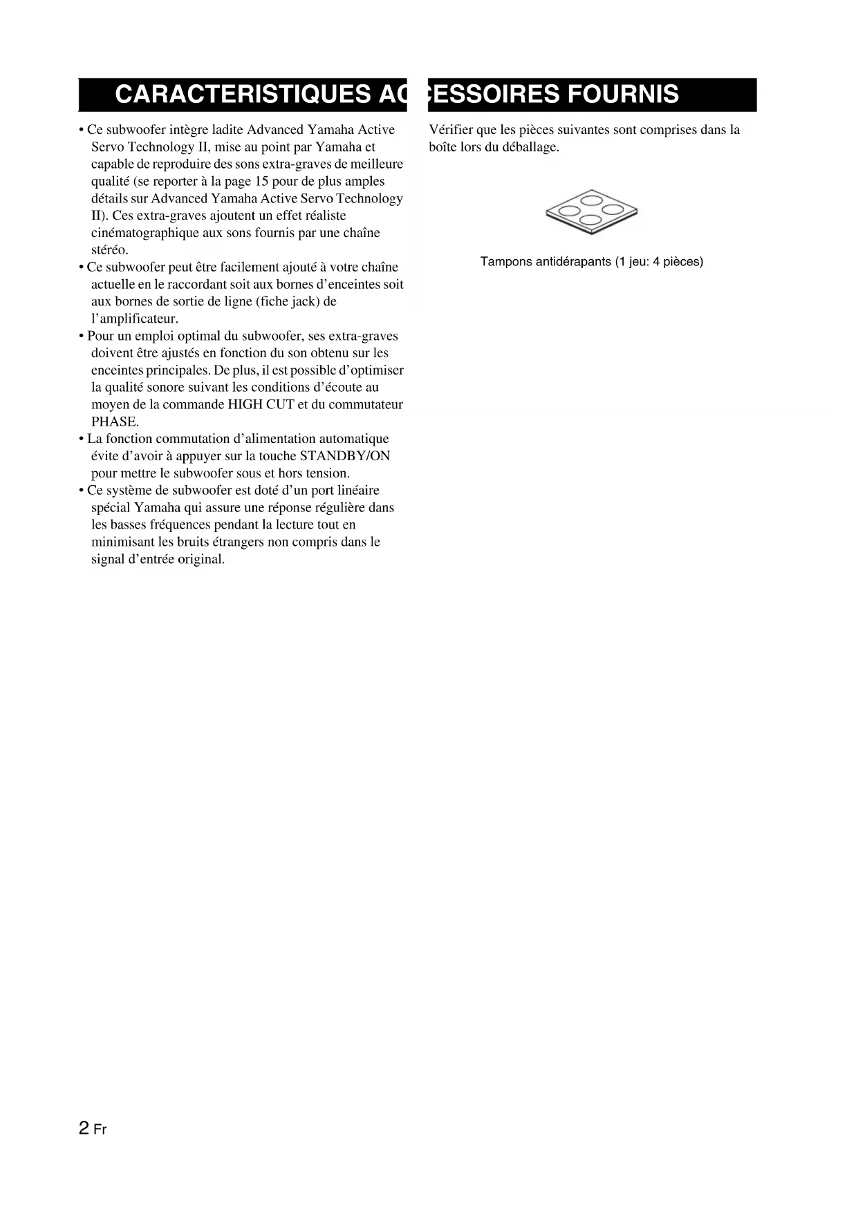 - Ce subwoofer intègre ladite Advanced Yamaha Active Servo Technology II, mise au point par Yamaha et capable de reproduire des sons extra-graves de meilleure qualité (se reporter à la page 15 pour de plus amples détails sur Advanced Yamaha Active Servo Technology II). Ces extra-graves ajoutent un effet réaliste cinématographique aux sons fournis par une chaîne stéréo.