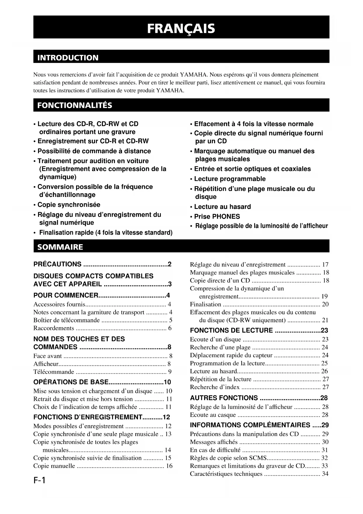 N’oubliez pas de lire la section “Précautions dans la manipulation des CD” de la page 29 qui fournit des conseils sur la manière de manipuler les disques et d’en prendre soin.F-4 Français