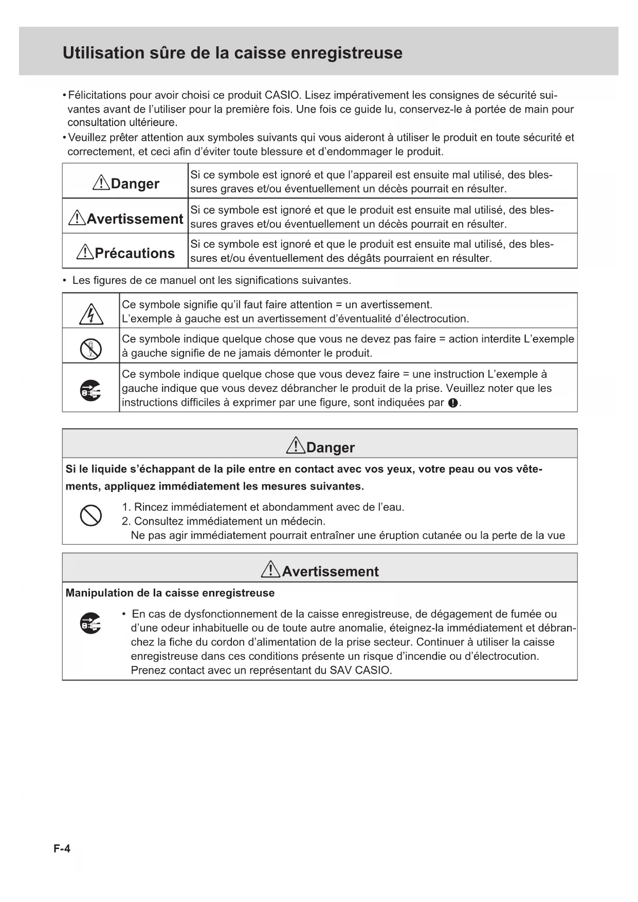 - En cas de dysfonctionnement de la caisse enregistreuse, de dégagement de fumée ou d’une odeur inhabituelle ou de toute autre anomalie, éteignez-la immédiatement et débran-chez la che du cordon d’alimentation de la prise secteur. Continuer à utiliser la caisse enregistreuse dans ces conditions présente un risque d’incendie ou d’électrocution. Prenez contact avec un représentant du SAV CASIO.F-5 Utilisation sûre de la caisse enregistreuse