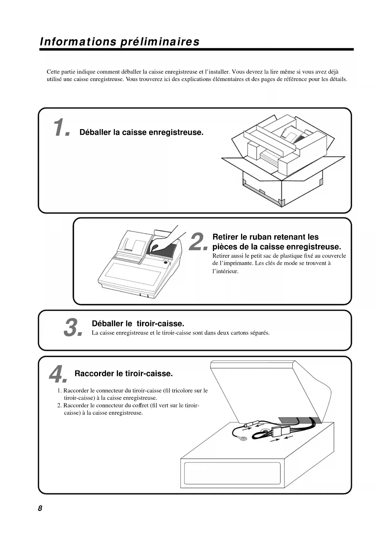 - Index Cette partie indique comment déballer la caisse enregistreuse et l’installer. Vous devrez la lire même si vous avez déjà utilisé une caisse enregistreuse. Vous trouverez ici des explications élémentaires et des pages de référence pour les détails. Déballer la caisse enregistreuse. Retirer le ruban retenant les pièces de la caisse enregistreuse. Retirer aussi le petit sac de plastique fixé au couvercle de l’imprimante. Les clés de mode se trouvent à l’intérieur. Déballer le tiroir-caisse. La caisse enregistreuse et le tiroir-caisse sont dans deux cartons séparés. Raccorder le tiroir-caisse. p. 1018